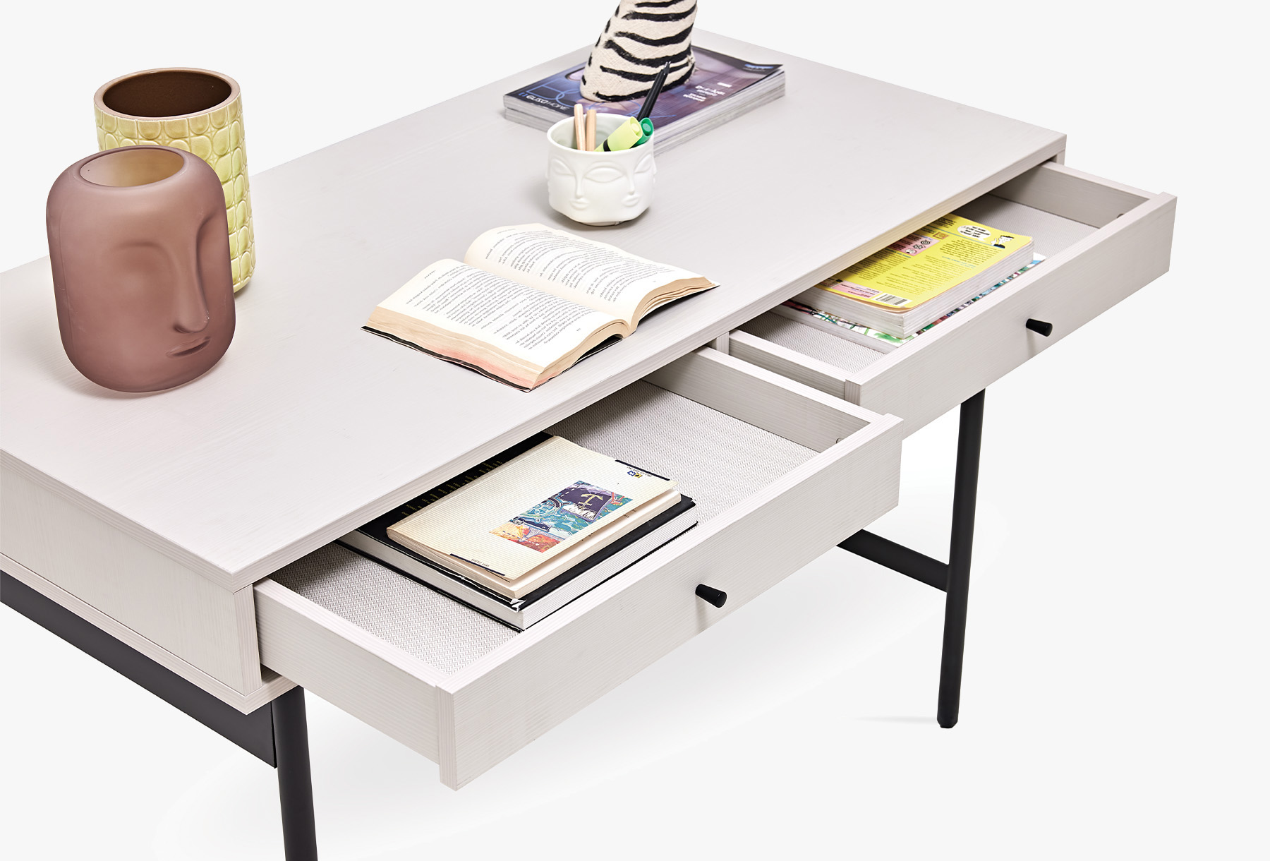 Предлага дълготрайна употреба, като съчетава модерния си вид, който идва от динамичния дизайн с качествения и издръжлив материал. Със своя модерен индустриален дизайн лесно се адаптира към всяко пространство, като същевременно предлага удобна употреба със своите метални матови черни крака. Приложението на 2 чекмеджета придава практичност и елегантност. Цветова комбинация от светъл орех и крем.