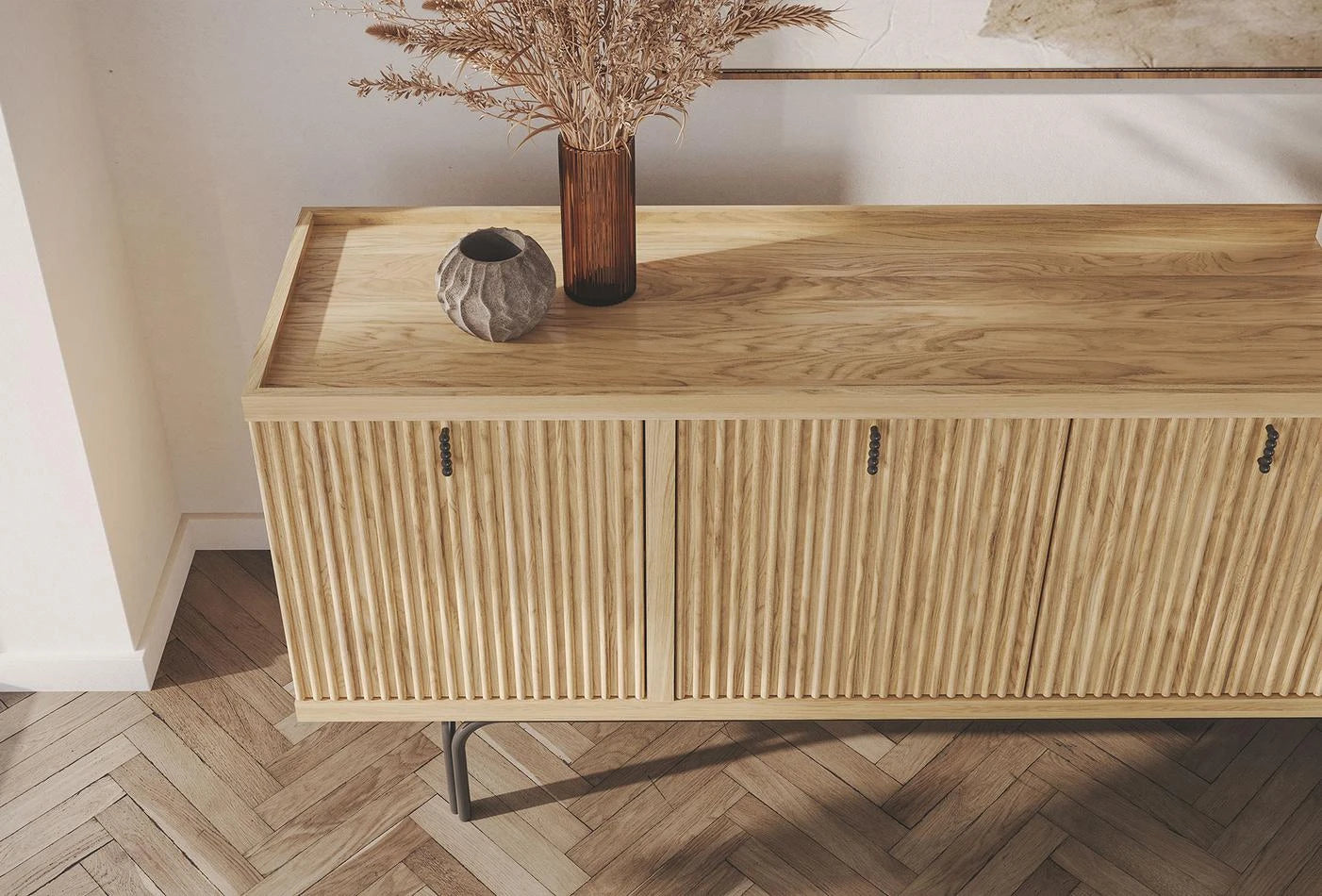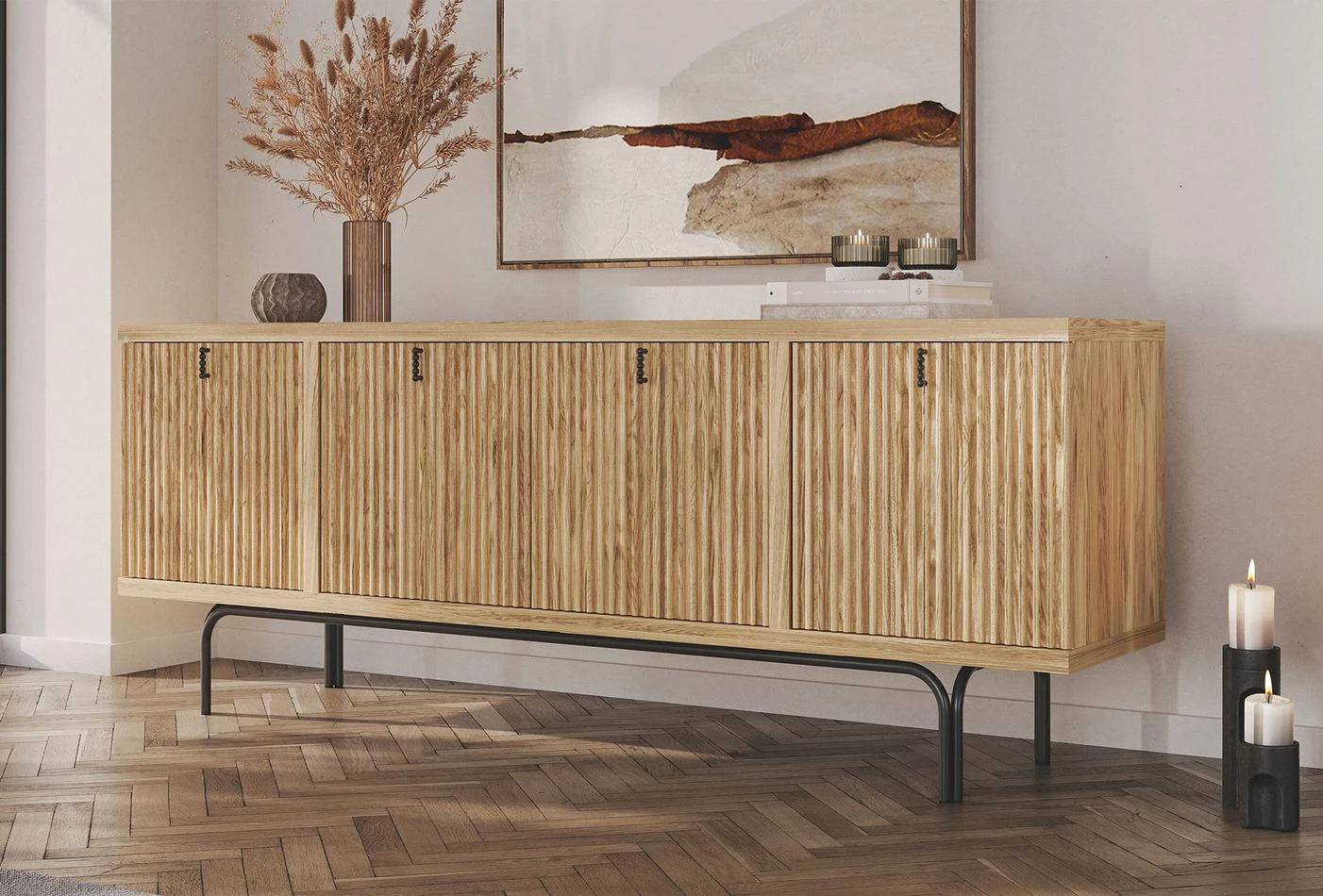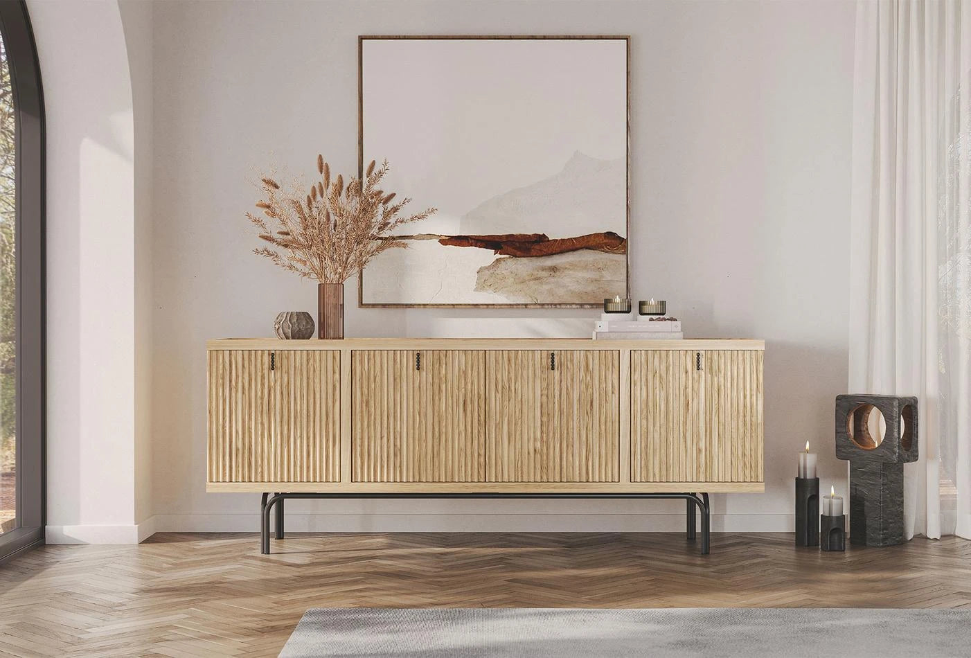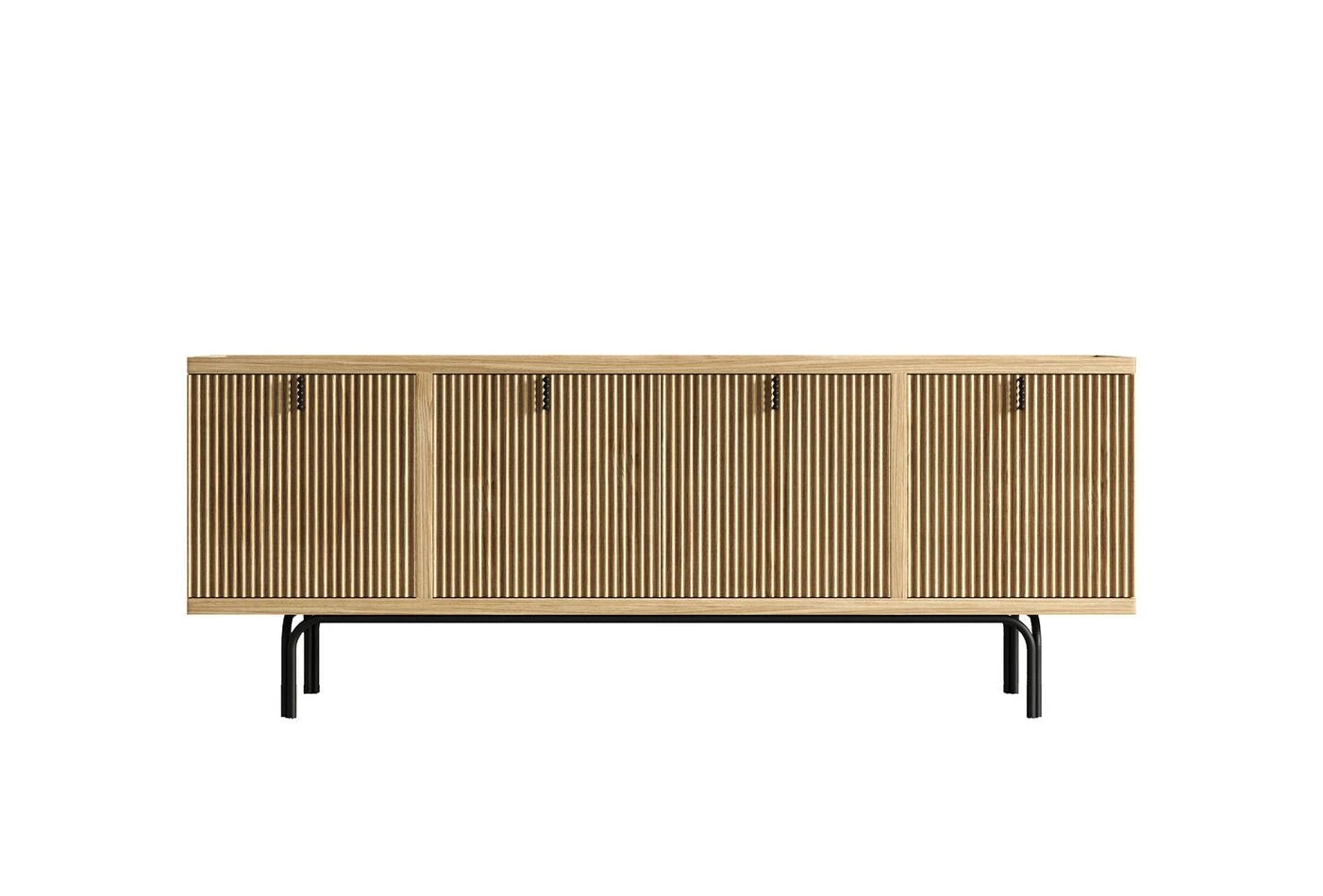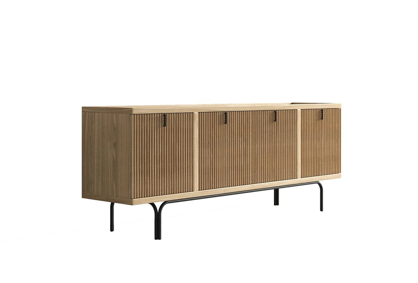 Бюфет Austin, предлага семпла естетика благодарение на естествения си вид. Aдаптира към всички жилищни пространства със елегантния си дизайн. Обогатен с детайли от дъбов фурнир върху MDF. Минималният дизайн на черните метални дръжки също добавя стилно докосване към конзолата.