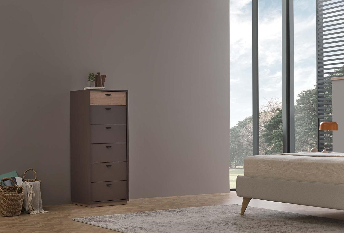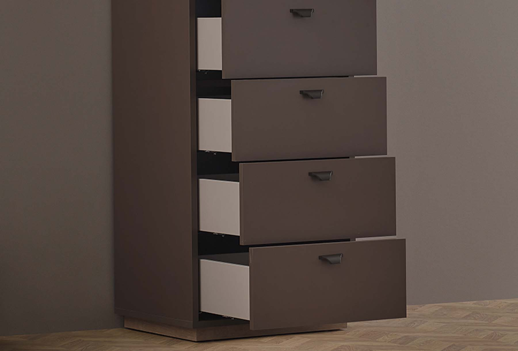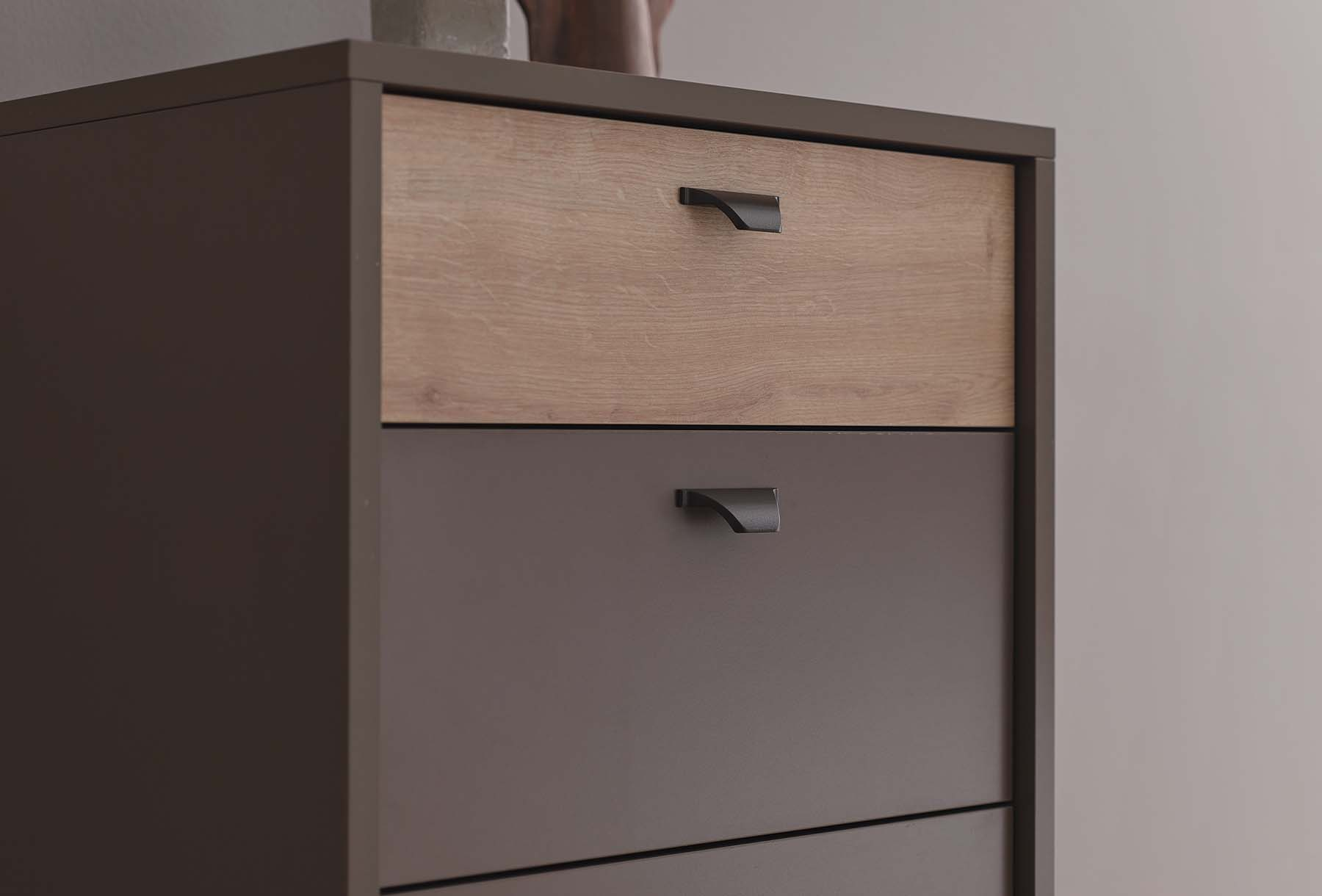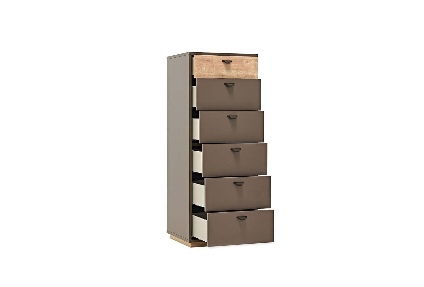 Шест чекмеджета с голям вътрешен обем идват заедно със спирачна релсова система, която можете да използвате лесно. Със своя ергономичен дизайн, скрин Polka ви позволява да използвате вашето жилищно пространство както желаете, като спестява място.