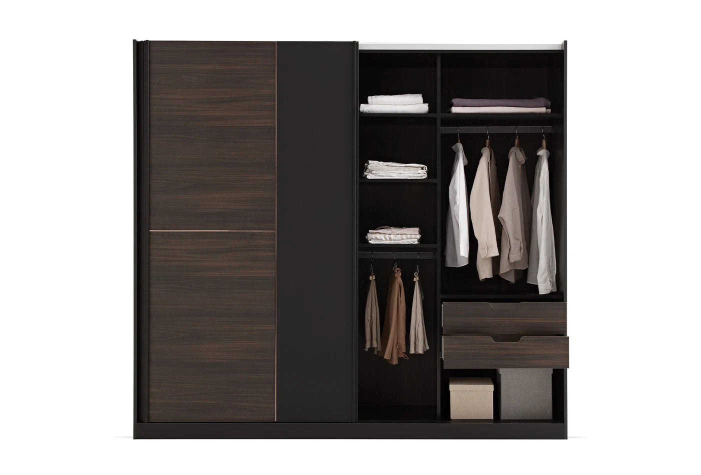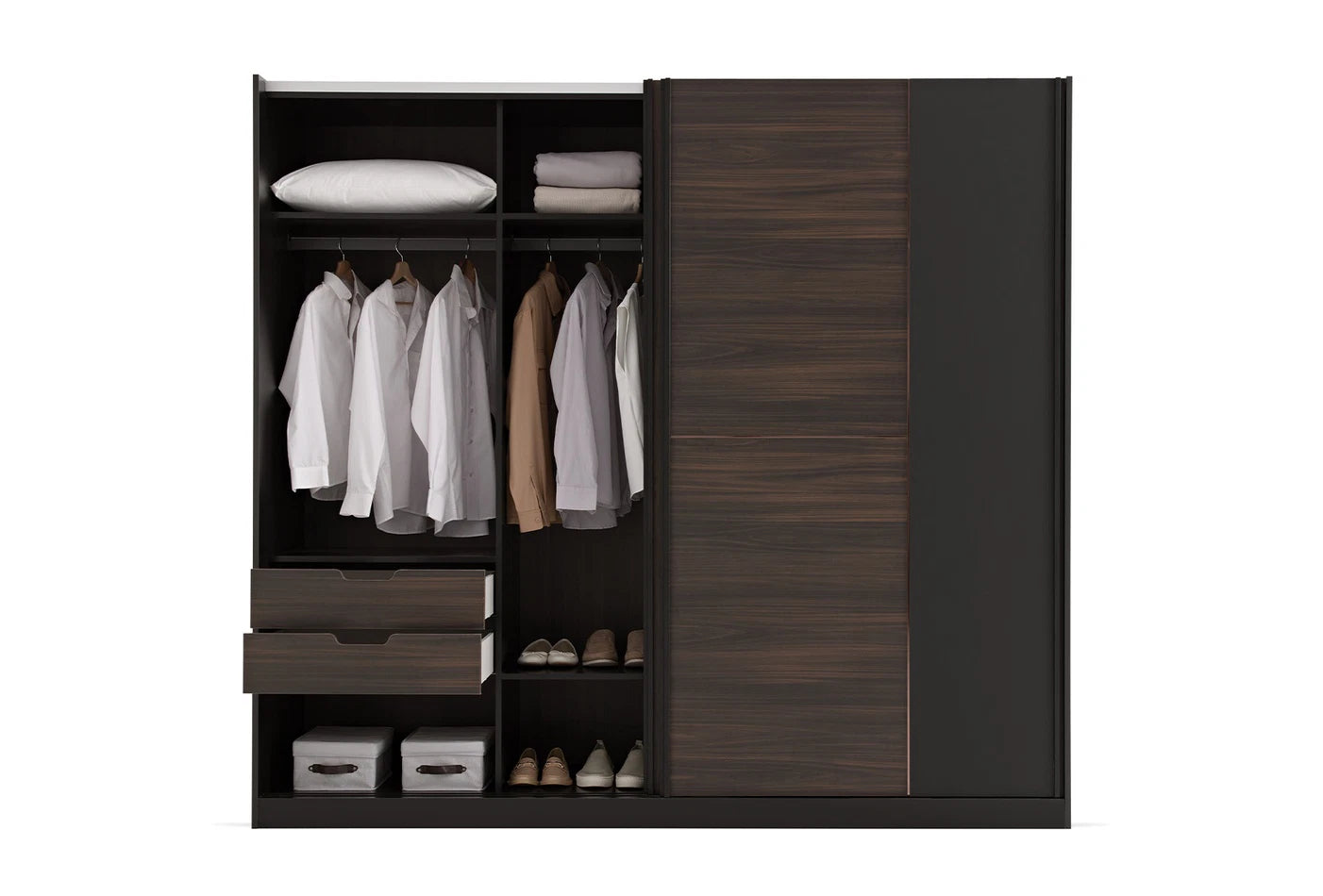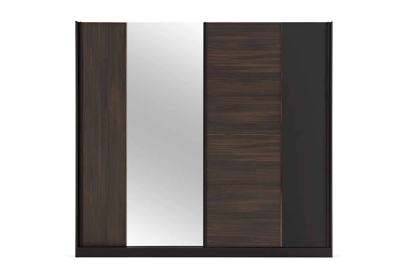 Проектиран с уникалната комбинация от тъмен орех и матово черно, гардеробът с плъзгащи се врати PARMA заема своето място в най-модерните жилищни пространства! Разкрива подходяща визия за всяко помещение със своя съвременен дизайн. Обещава дълготрайна употреба със силната си конструкция.