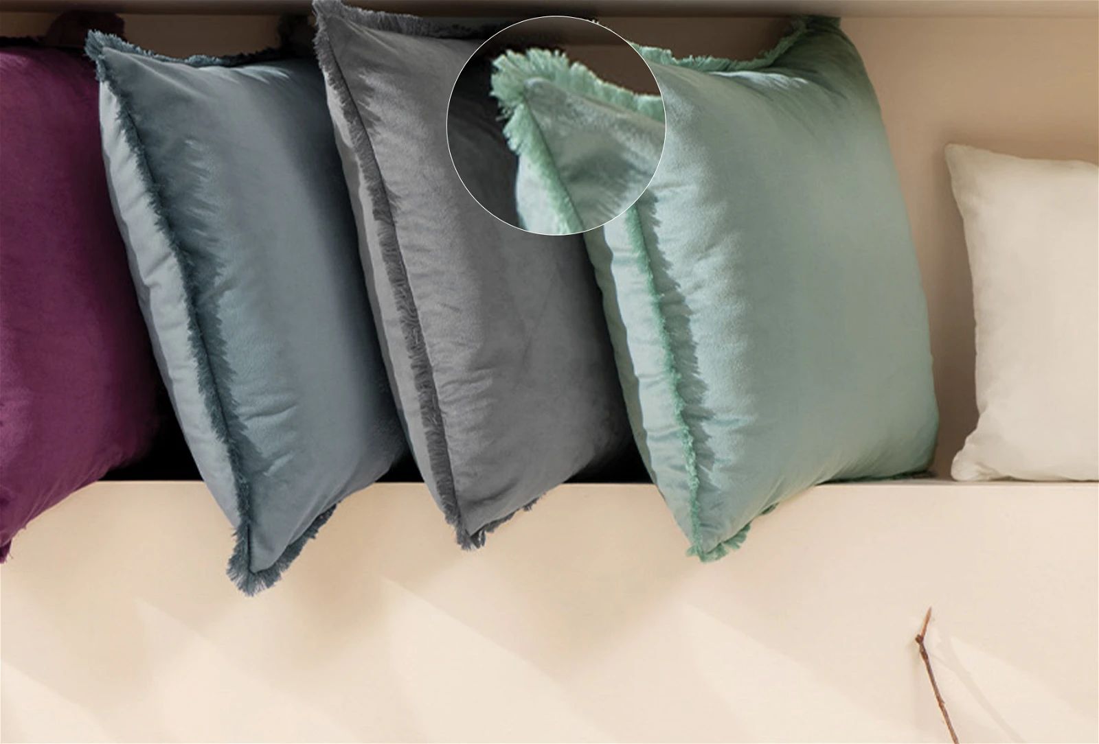 Декоративна възглавница Donna, добавя комфортно и луксозно докосване на жилищните пространства с меката повърхност и лъскавия вид на кадифената тъкан, в комбинация с изчистен дизайн и детайли с пискюли.