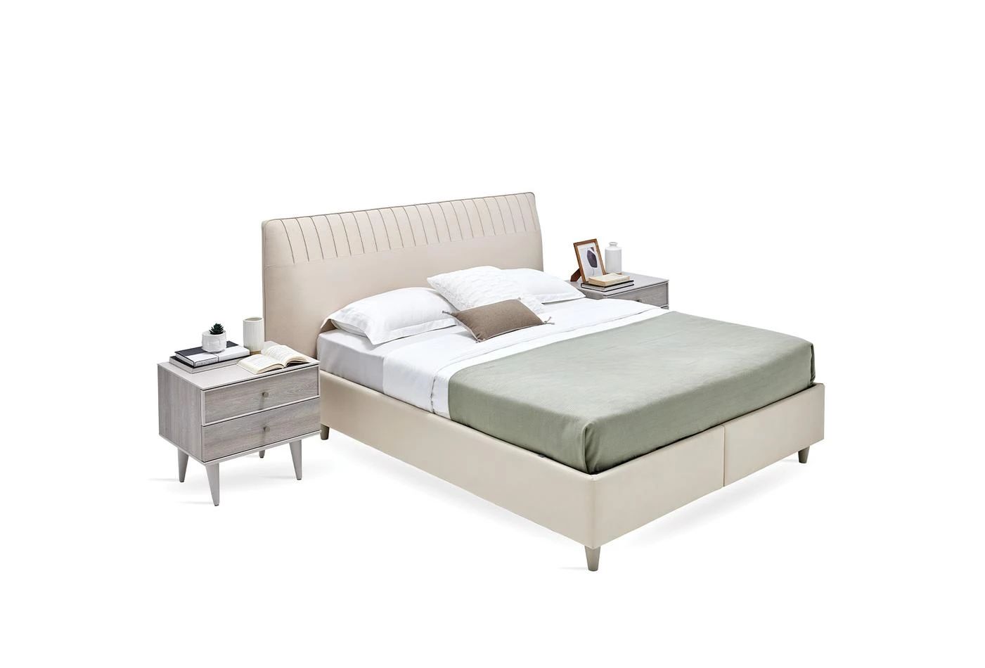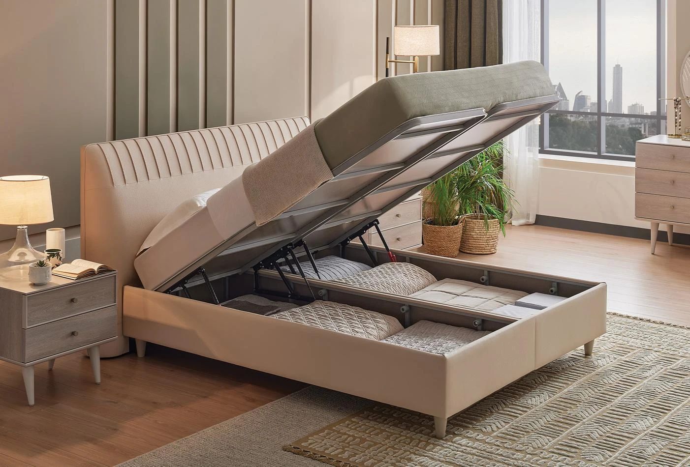 Благодарение на покритата с плат рамка на леглото и удобната структура предлага качествен сън и същевременно обогатява декорацията на спалнята. Докато отразява простата елегантност на естествеността със своята цветова комбинация от светъл дъб и светло бежово, апликацията с фитил върху таблата помага да се добави уникална атмосфера към пространството с иновативни щрихи.