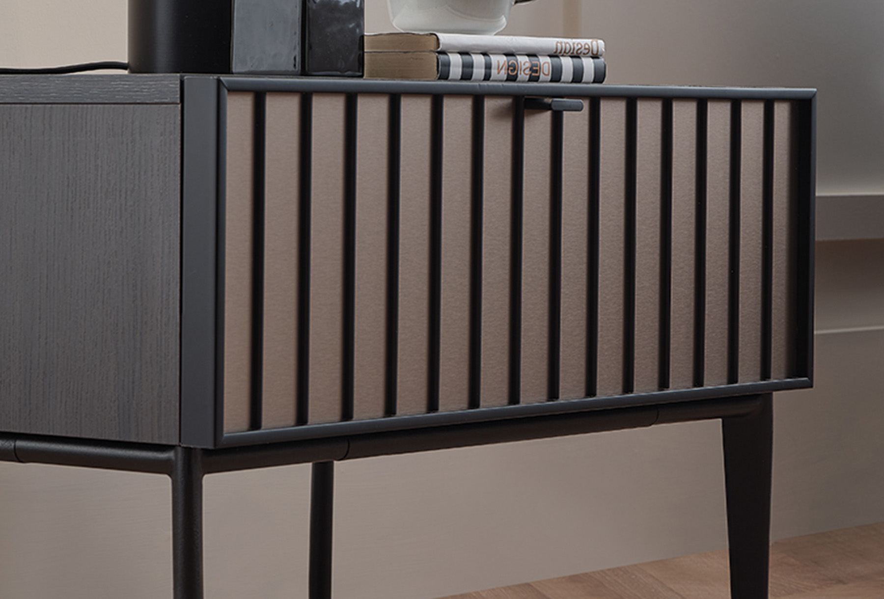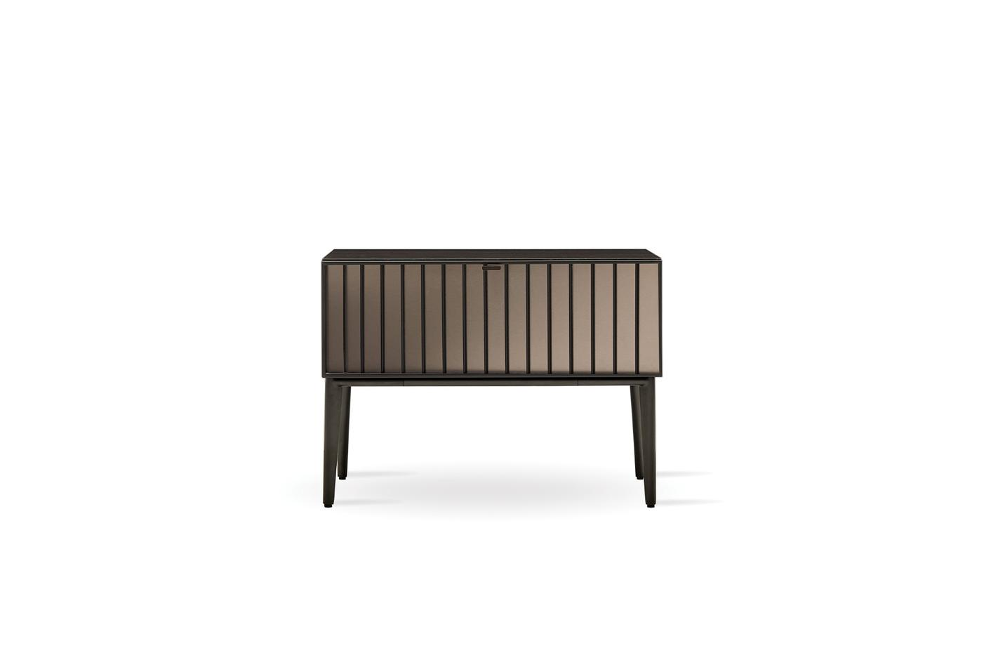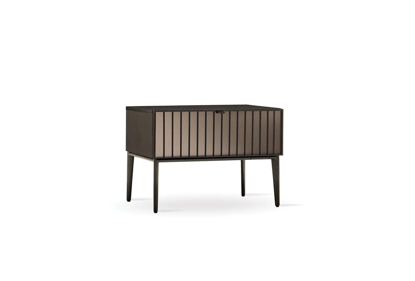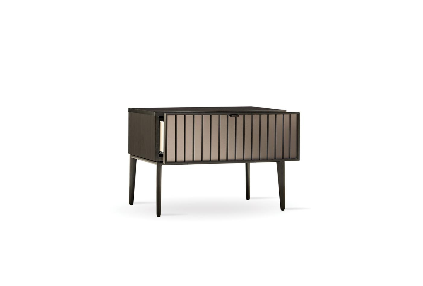 Като допълваща част от спалните, нощното шкафче от серията придава хармония и функционалност на пространството със своя стилен дизайн, който се адаптира към класическия и модерен стил. Откроява се със своята черна линейна комбинация с метален ефект и използването на ексклузивни материали, като матово черни дръжки и крака. Със своето чекмедже осигурява полезна зона за съхранение на предмети, които е желателно да бъдат достигнати бързо в спалните.