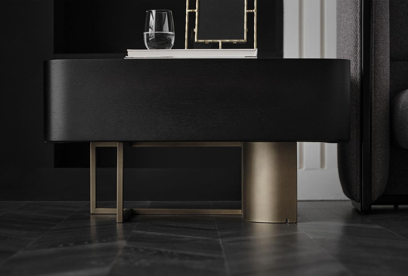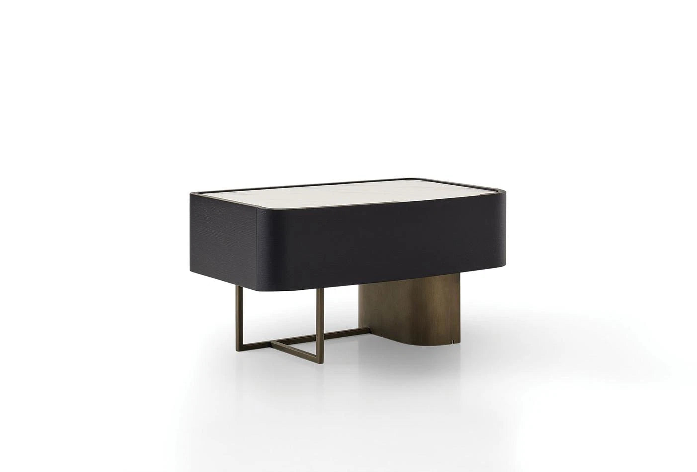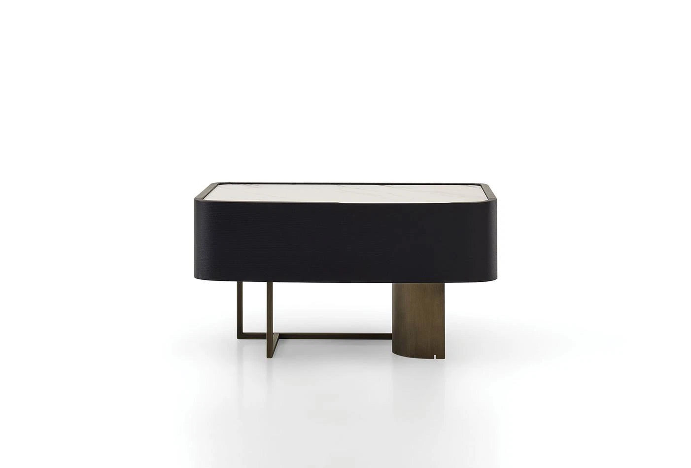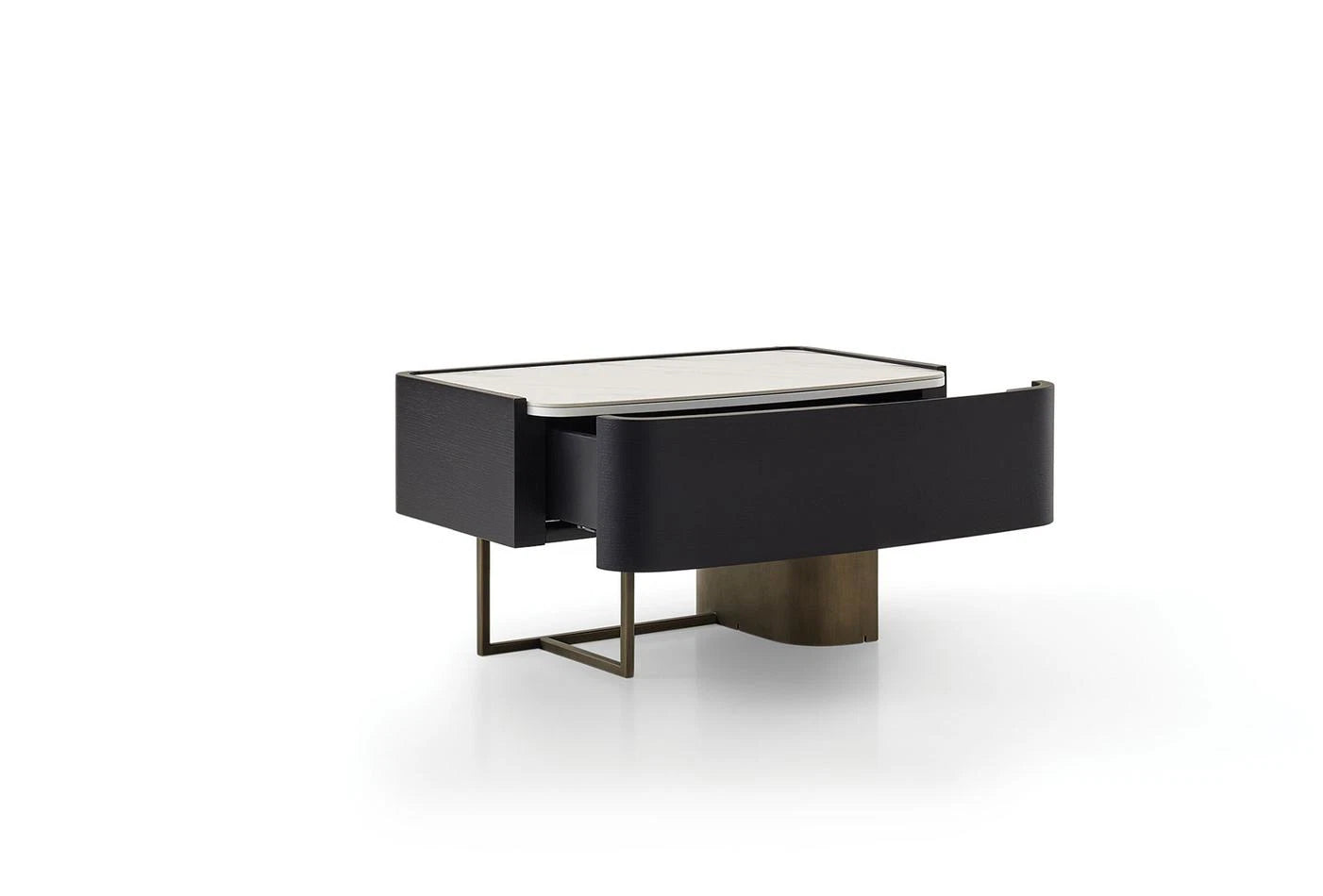 Suva е продукт от серията Visions 2024 и се отличава с модерните си заоблени линии и елегантен дизайн. Горната повърхност предлага луксозно докосване със своето керамично покритие, наподобяващо мрамор. Черният цвят на естествения фурнир върху МДФ придава на нощното шкафче естетичен и стилен вид.