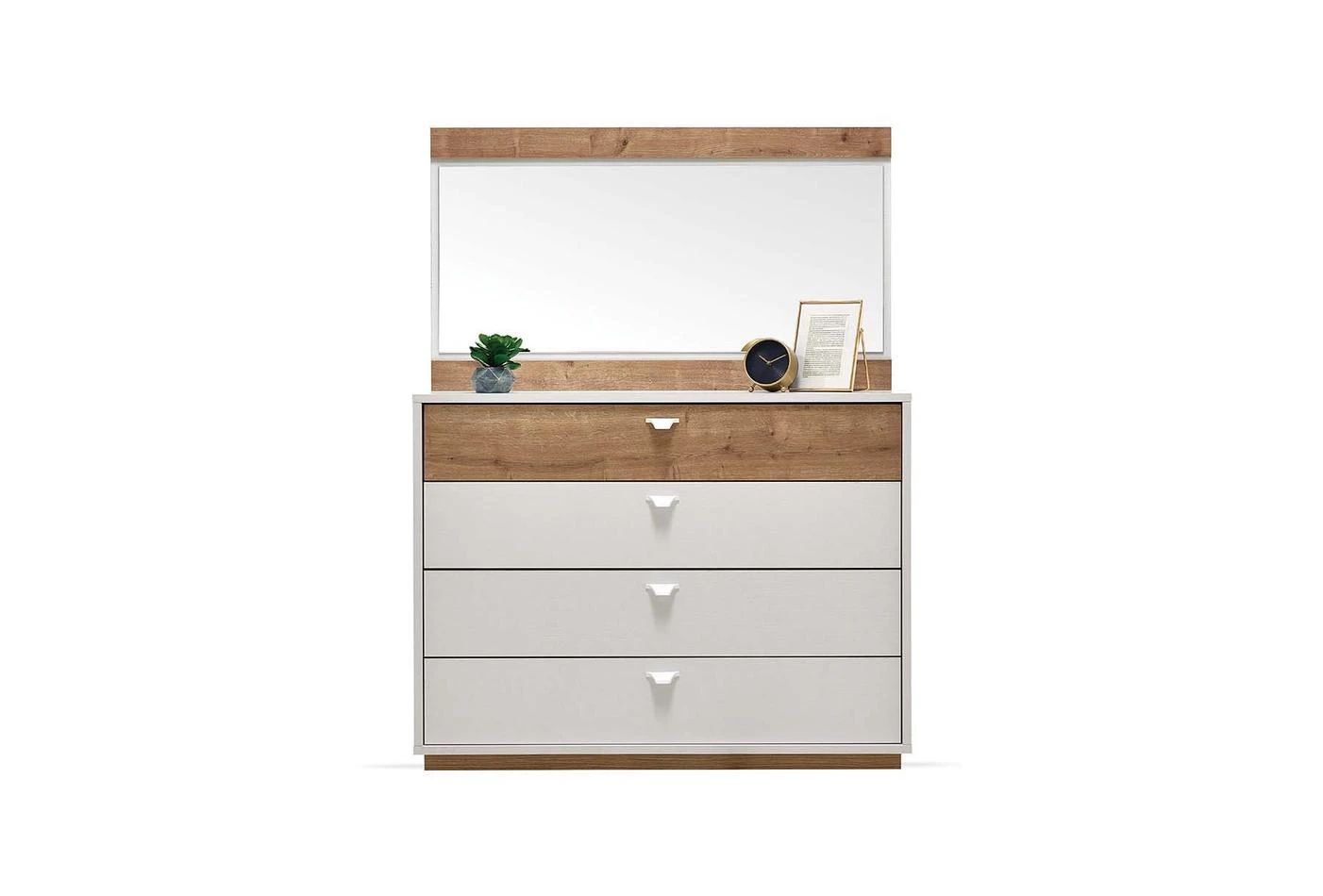 Подкрепяйки модерната концепция за дизайн с естествения вид, предлаган от дървените детайли, огледалото носи със себе си новаторска атмосфера с елегантни нотки. Предлага безопасно и стилно изживяване при използване със своята здрава структура и естествено огледало. Добавя визуално богатство към вашата спалня с цвета на рамката бял дъб.