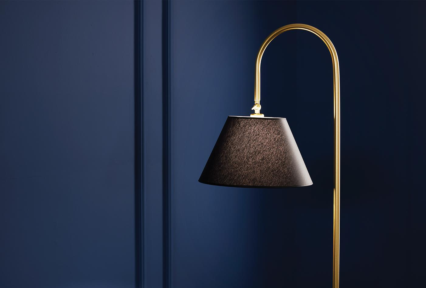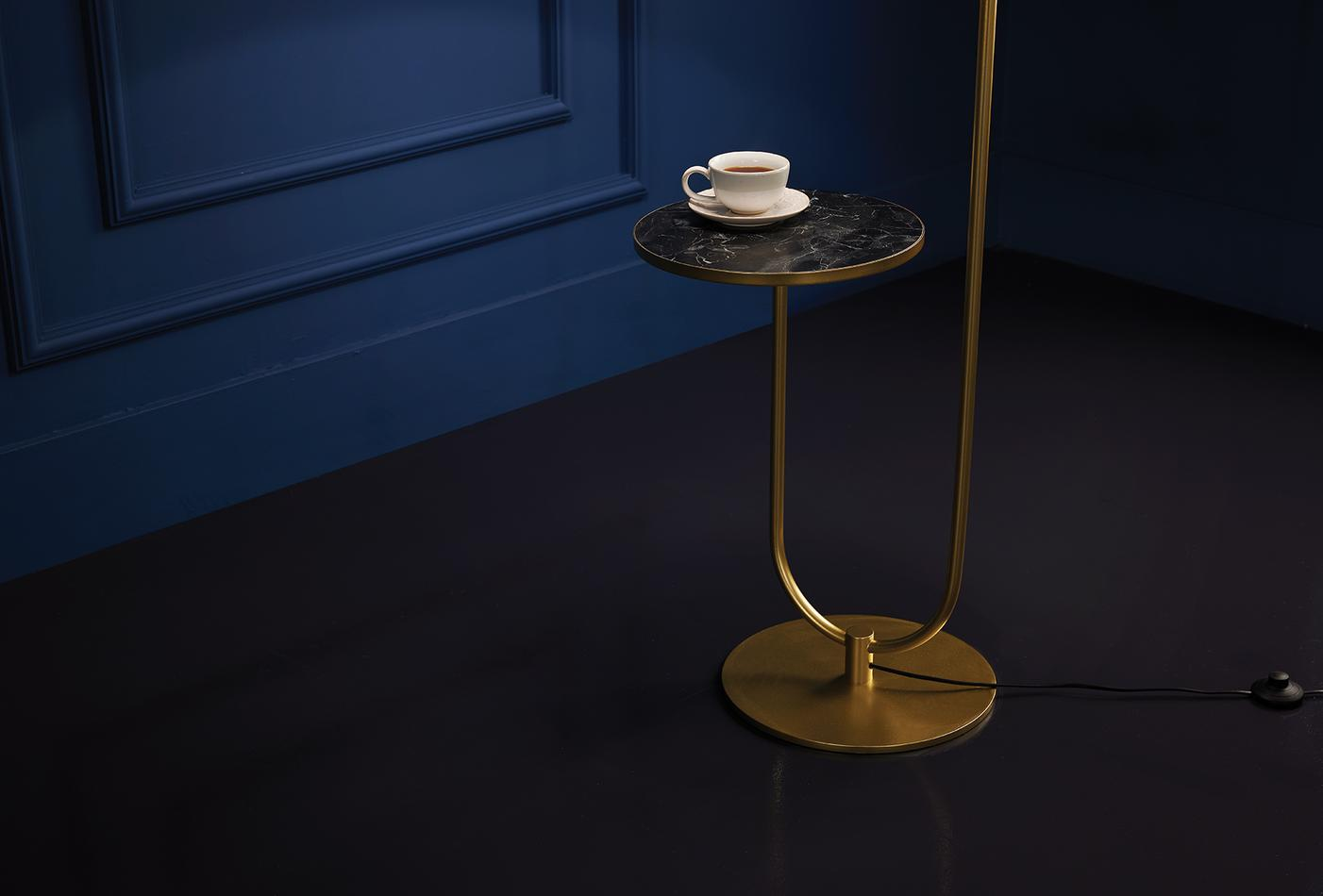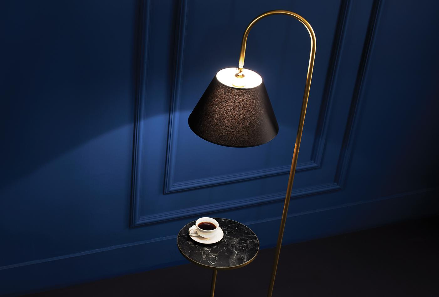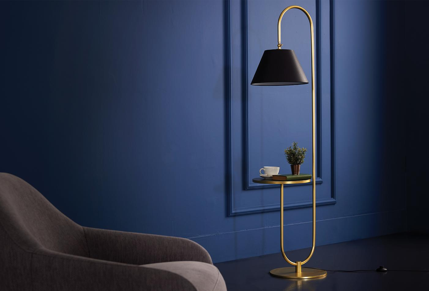 Предлагайки впечатляващ пример за модерен стил със своя привлекателен златен дизайн на тялото и черна глава, носи естетика и функционалност заедно с функцията си за мраморно изглеждащата дървена масичка за кафе, която осигурява предимството да се използва особено до фотьойла. Има метално тяло и дизайн на черна конична шапка. Тъканната глава може да се избърсва и движи в желаната посока. Крушка max 40W - E27 .