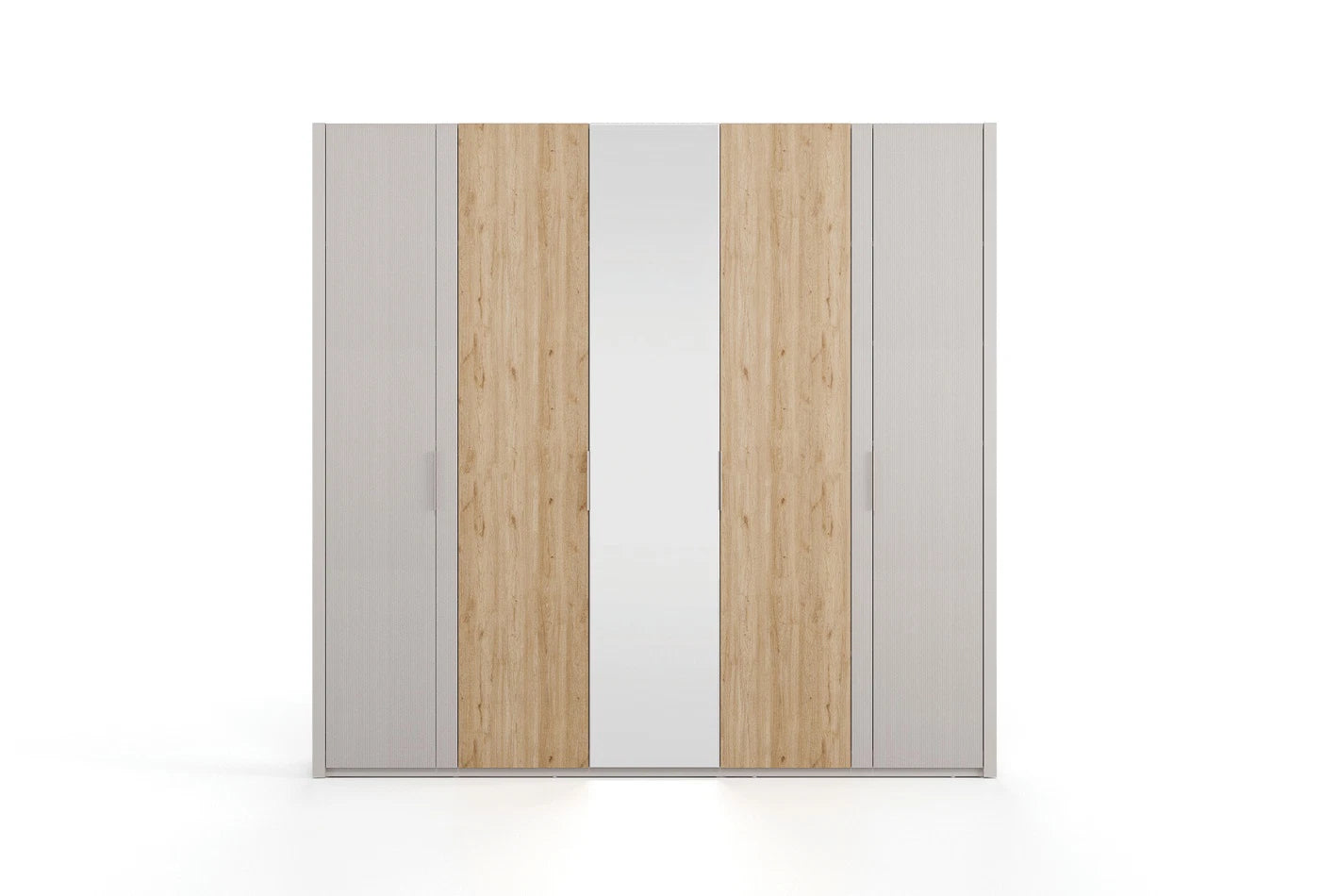 Със своята комбинация от естествен дъб и бежов цвят внася топла и елегантна атмосфера в спалните ви. Специалните шарени текстури и огледалата в естествен цвят, използвани при вратите, подчертават естетическата стойност на дизайна, а металните дръжки от инокс добавят модерно докосване.