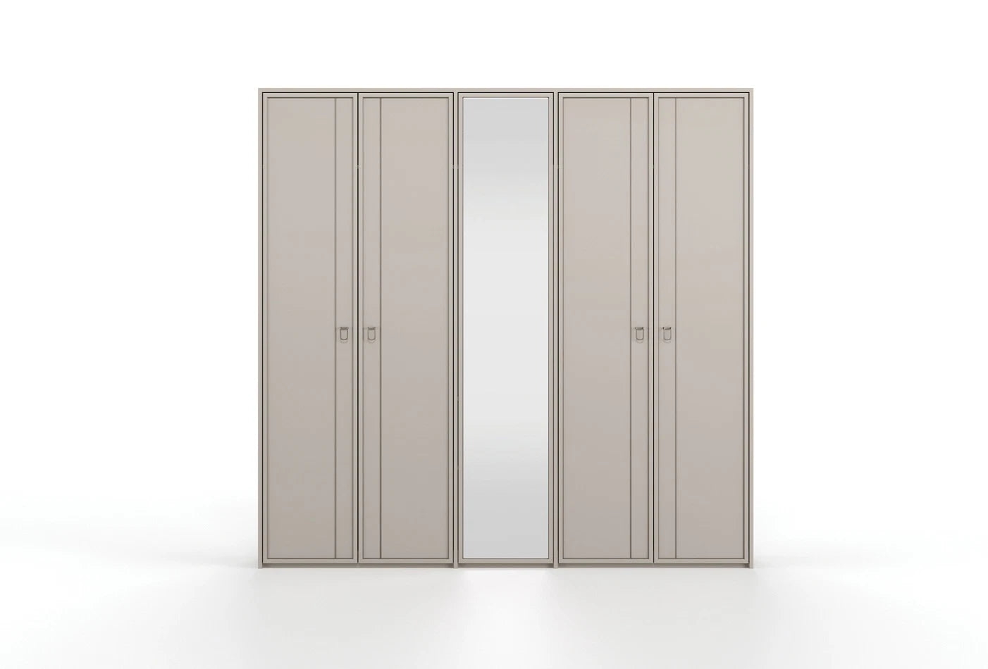 Гардероб HERA представлява идеалния синтез между елегантност и функционалност. Успокояващият камъчен нюанс на корпуса се хармонира перфектно с естествените огледални детайли, а луксозните метални дръжки в бронзов цвятдобавят съвременна изтънченост.