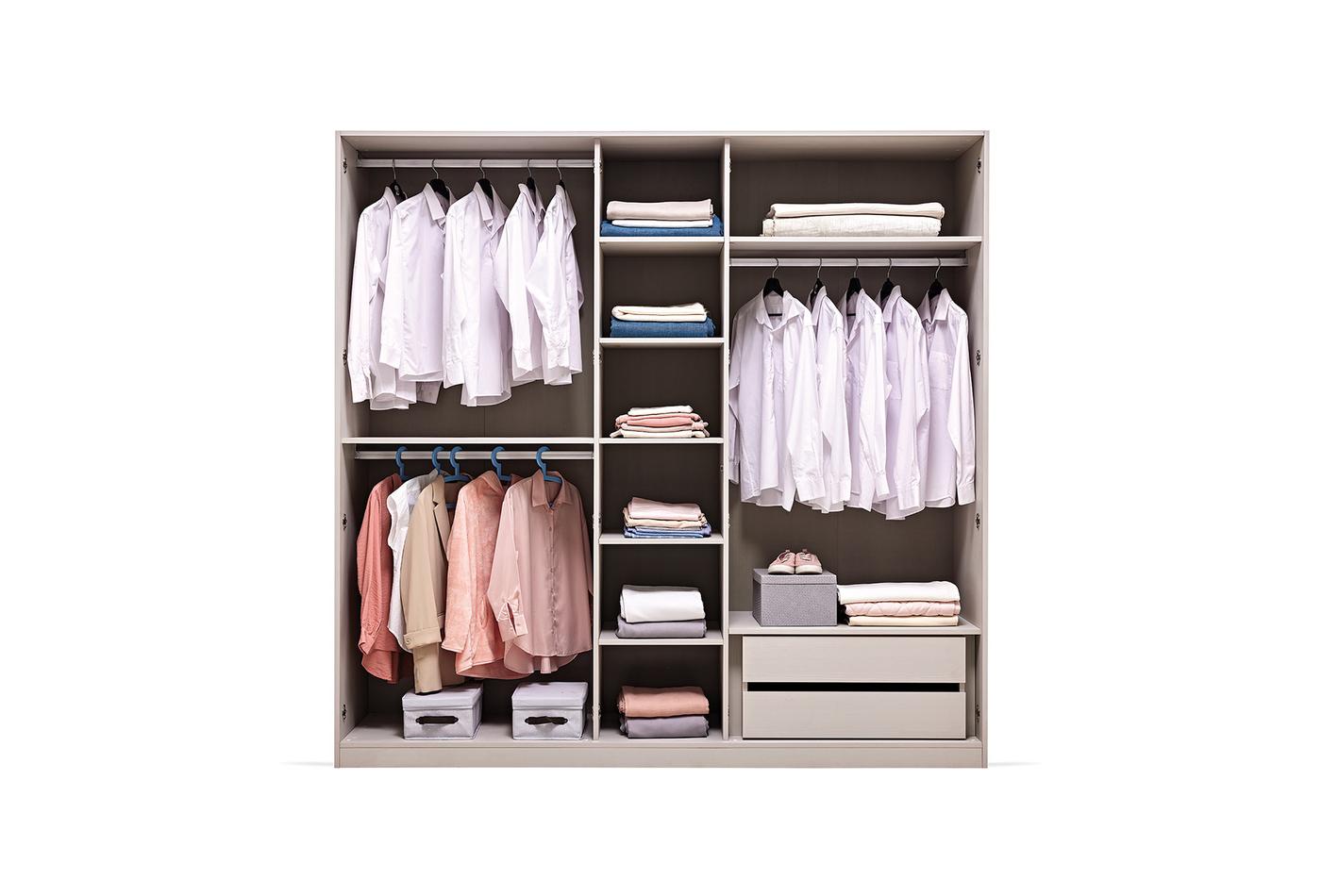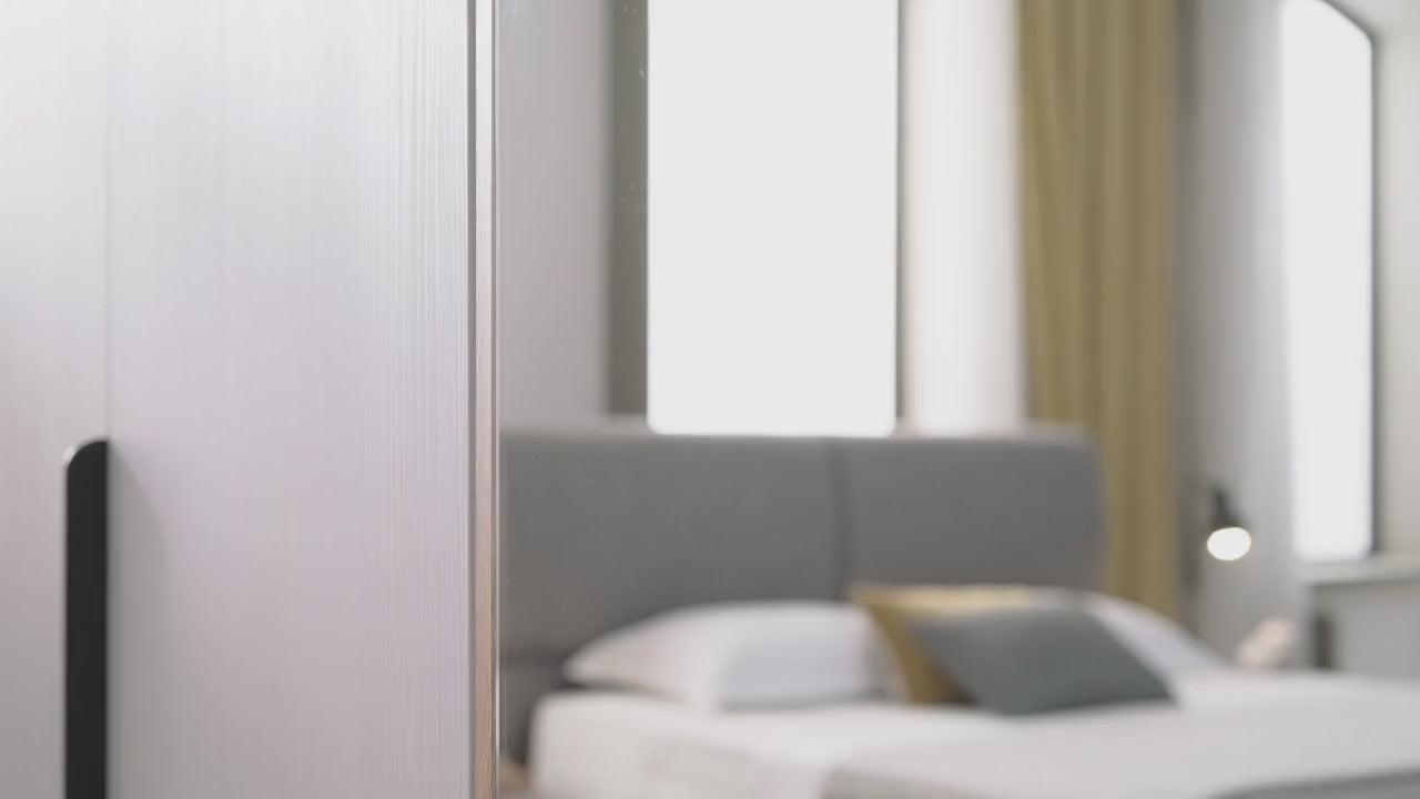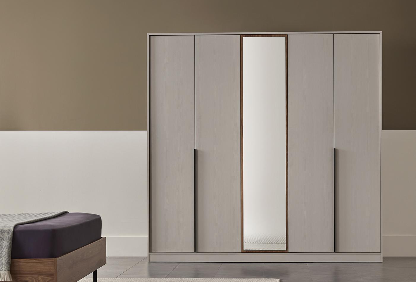Перфектното цветово съчетание и текстурите на различните елементи, в комбинация с огледалото от закалено стъкло в гардероба придават усещане за пространство във Вашата спалня. А зад вратите се открива завидно място за съхранение с функционало разпределение.