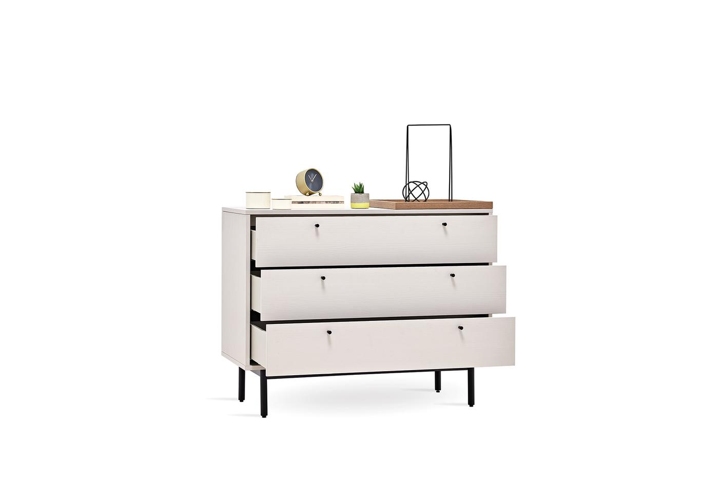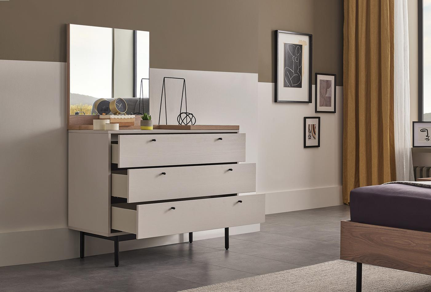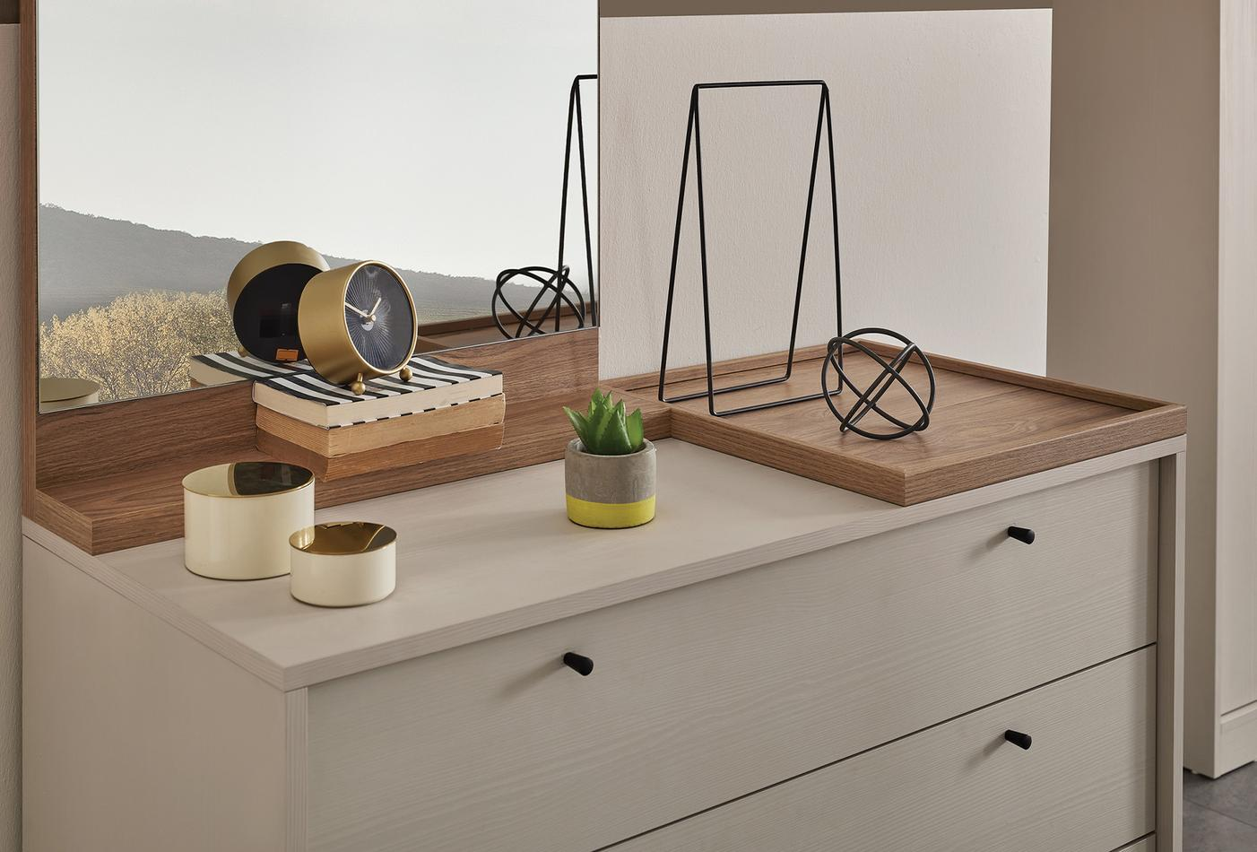 Доминиран от динамичен дизайн и стилни линии се превръща в неразделна част от декорацията на спалнята. Докато съживява жилищните пространства със своята комбинация от светъл орех и крем привлича вниманието с наситената си текстурирана повърхност, която предлага естествен вид. Металните матово черни крака и дръжки придават модерен вид на колекцията.