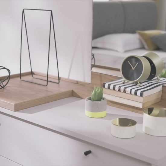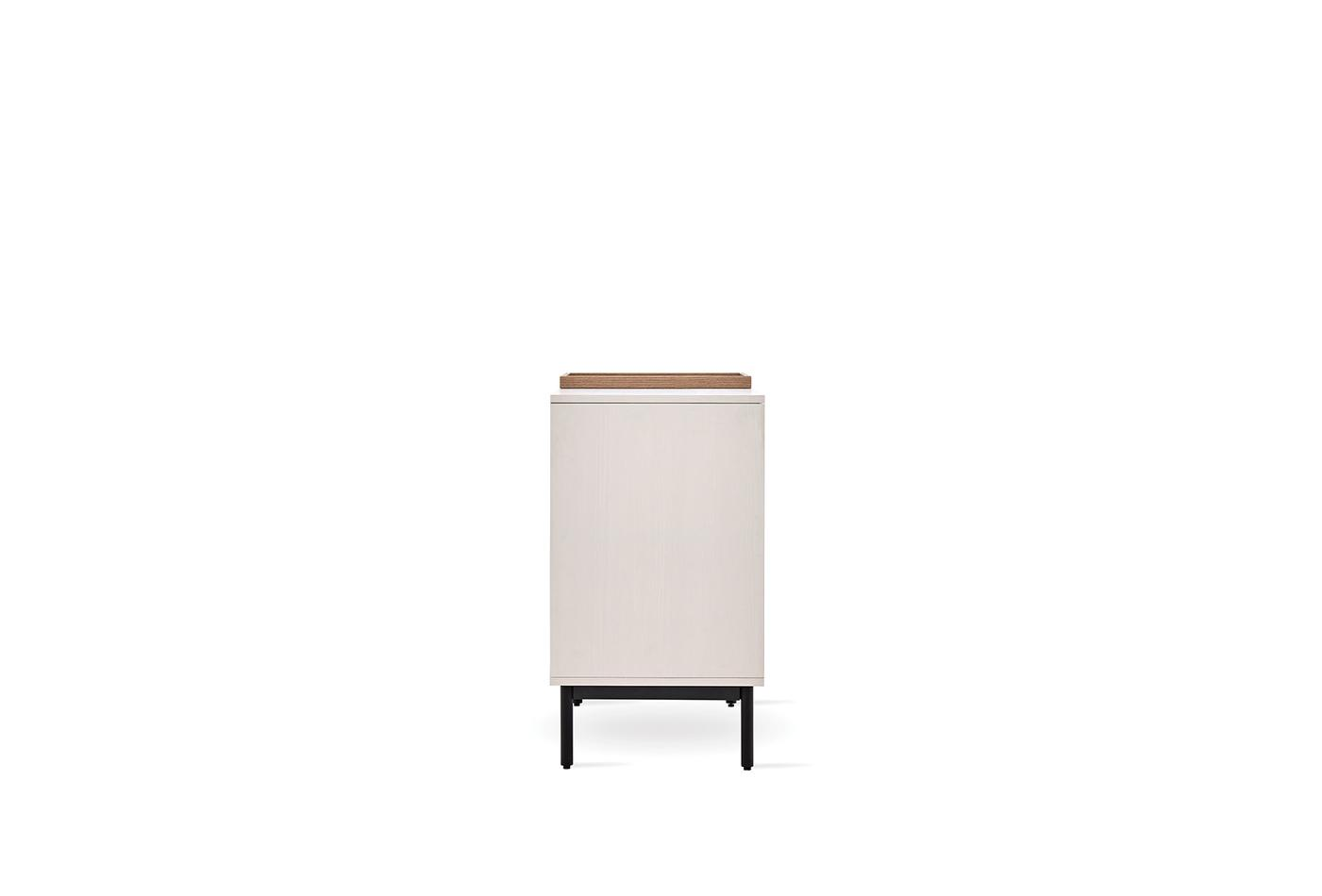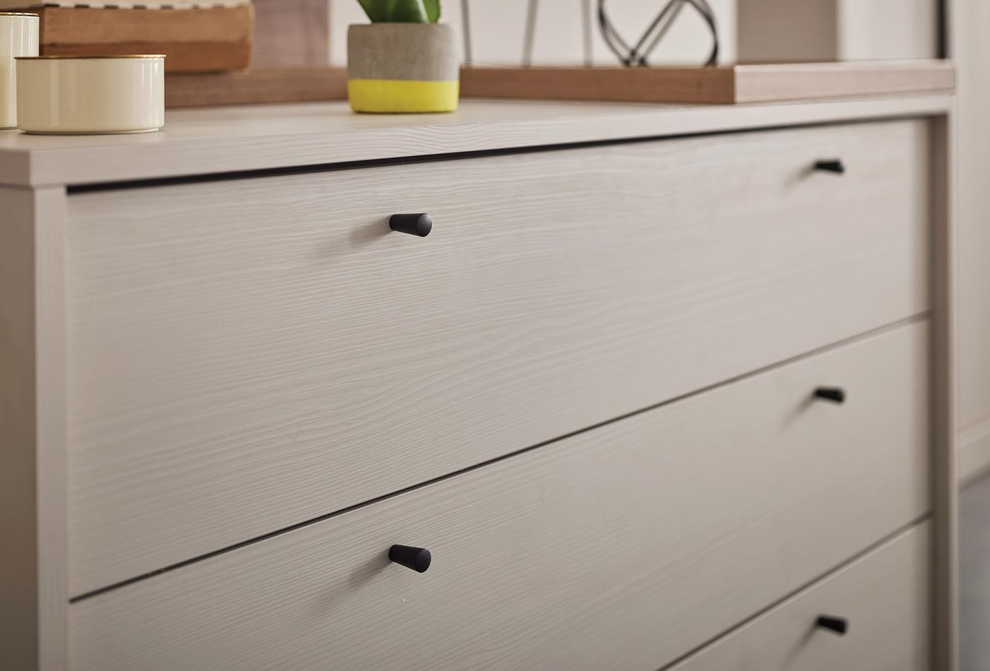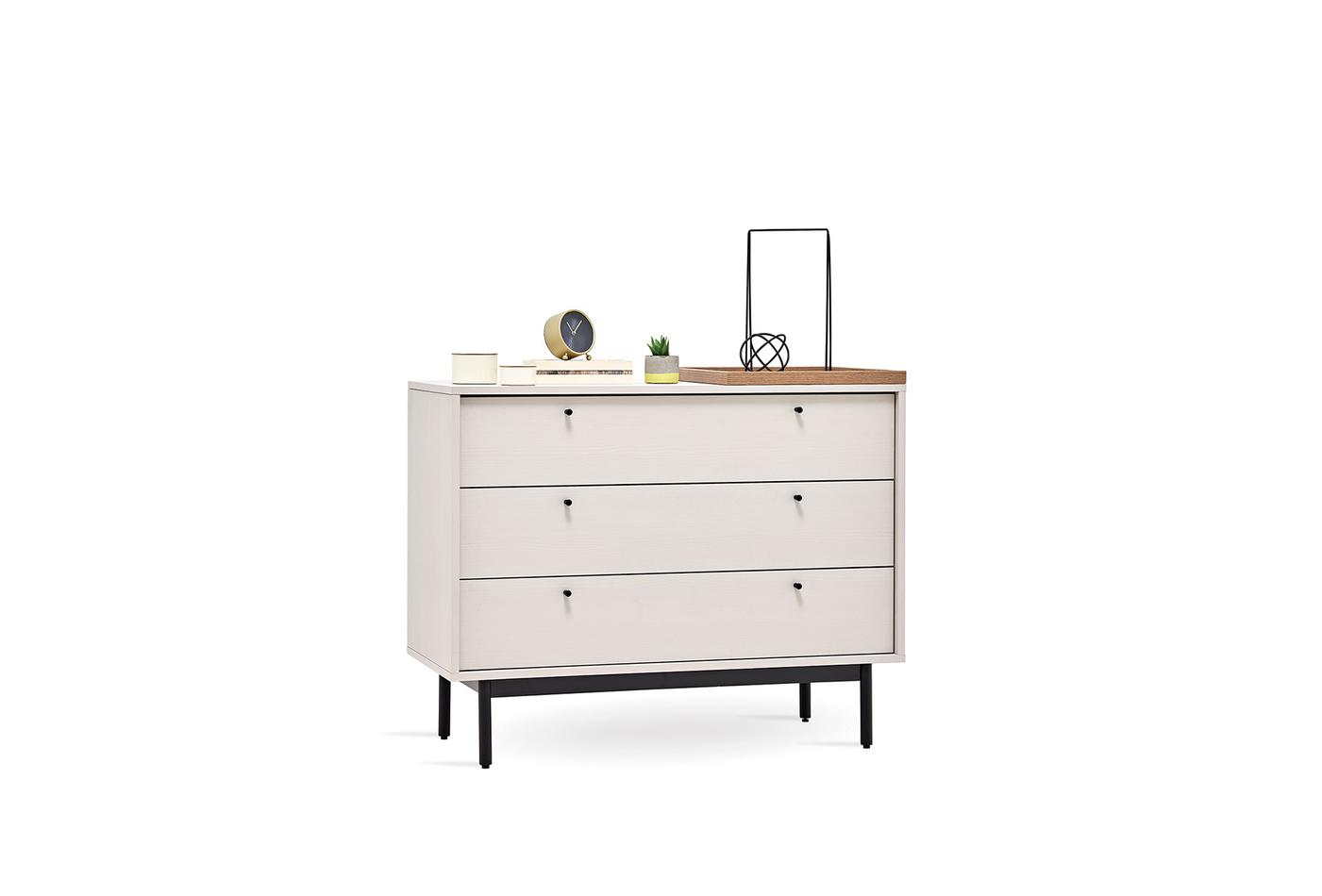 Доминиран от динамичен дизайн и стилни линии се превръща в неразделна част от декорацията на спалнята. Докато съживява жилищните пространства със своята комбинация от светъл орех и крем привлича вниманието с наситената си текстурирана повърхност, която предлага естествен вид. Металните матово черни крака и дръжки придават модерен вид на колекцията.