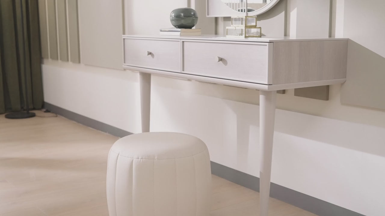 Отроява се с уникалния си стил, който придава на спалните елегантен вид. Оригиналният дизайн под формата на цилиндър, в който се усеща меката текстура на кремавия тон, предлага удобно използване в зоната за гримиране.