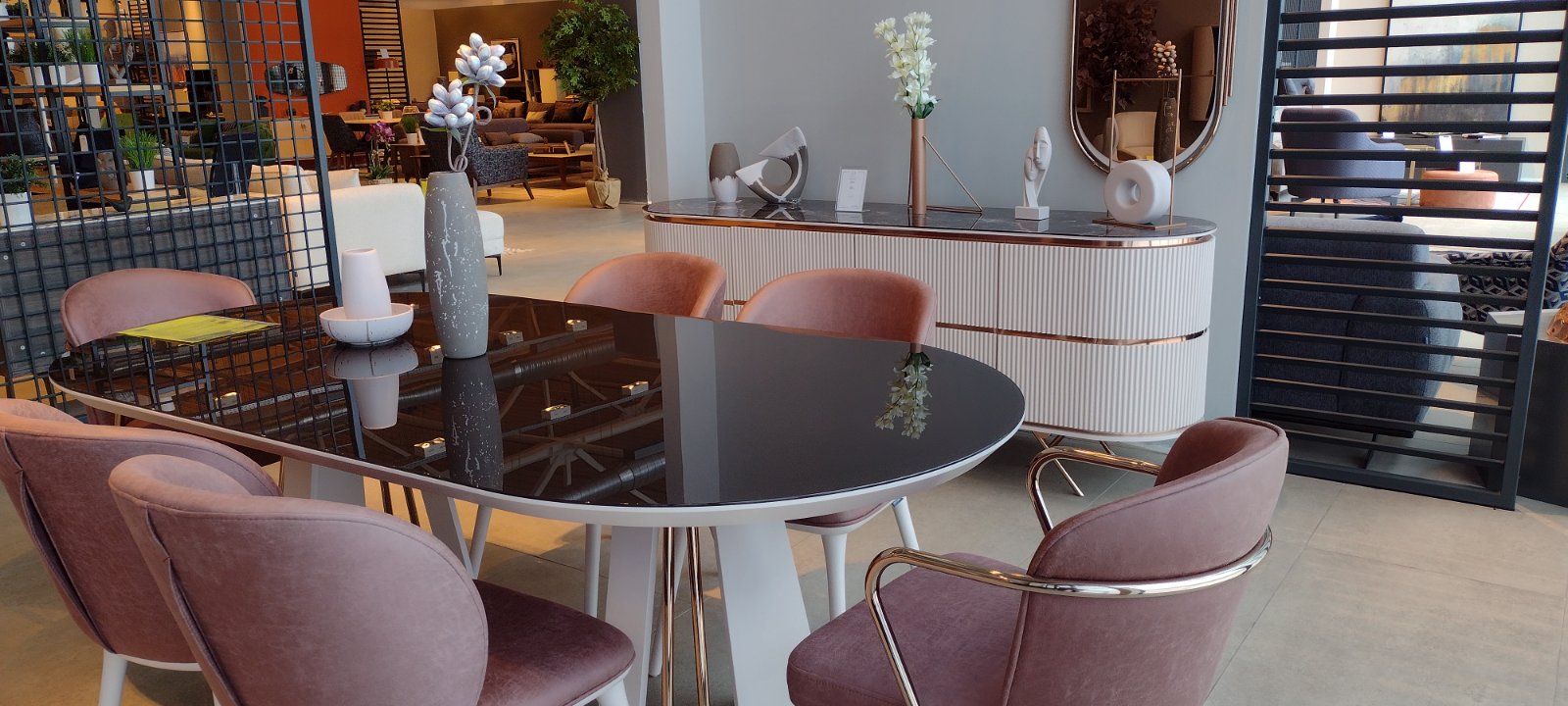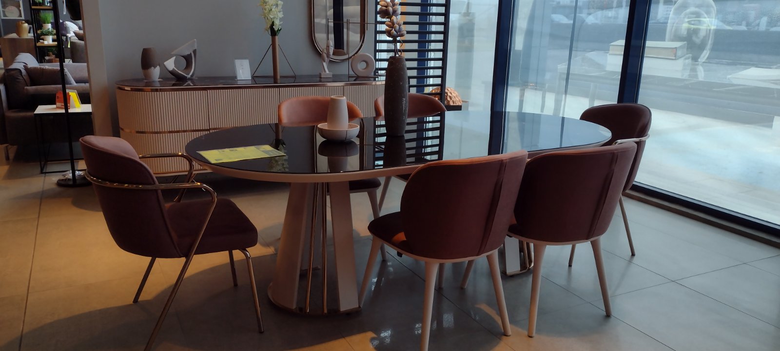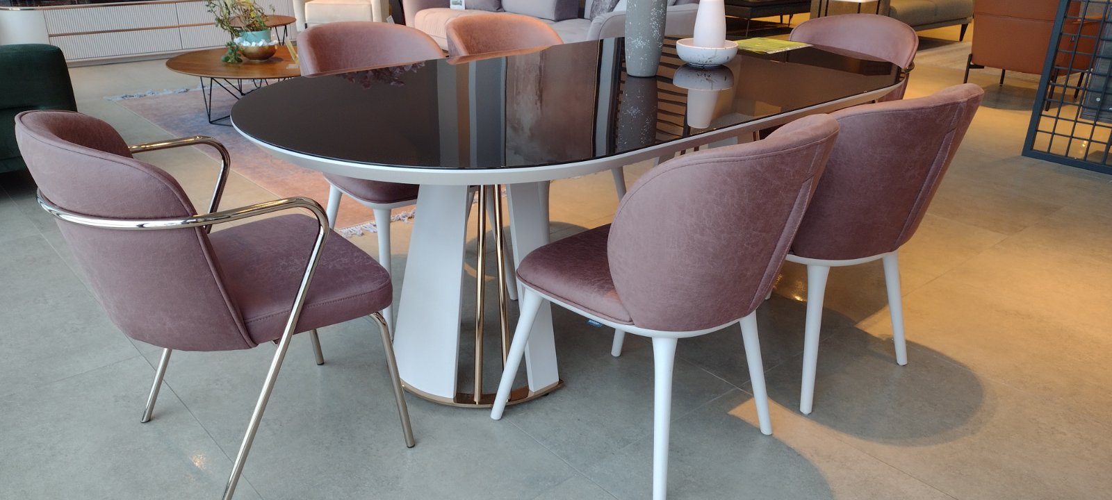 Овална трапезна маса с тъмно стъкло: Ширина: 220 см / Височина: 76 см / Дълбочина: 95 см