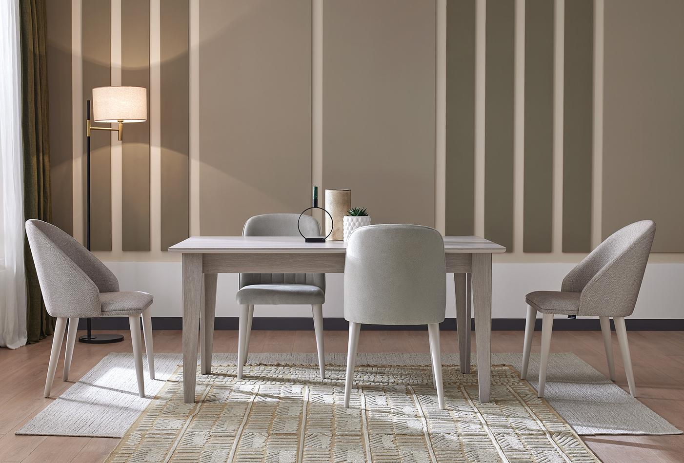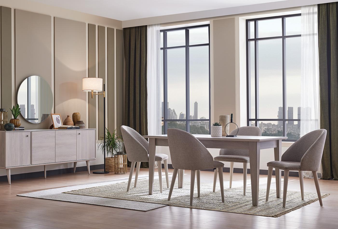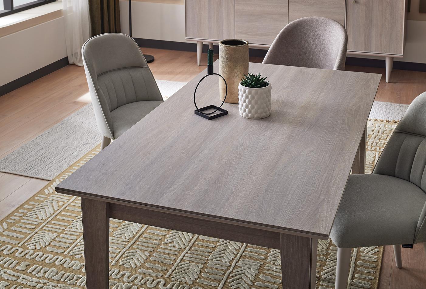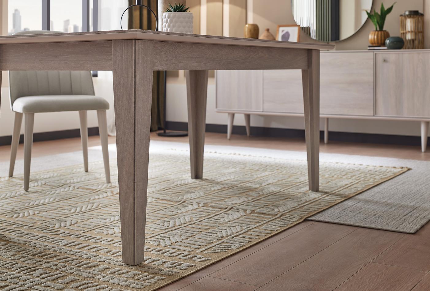 Със своята правоъгълна форма, която е отражение на нейния минималистичен дизайн, предлага пространство, където гостите могат да се настанят удобно с капацитет от 4-6 души. Цветова комбинация светъл дъб и бежово