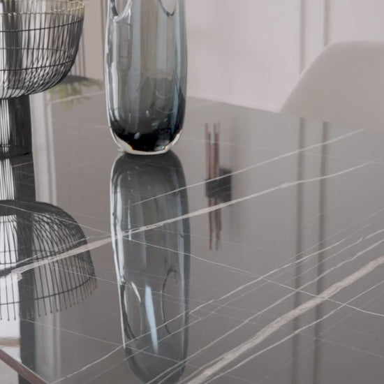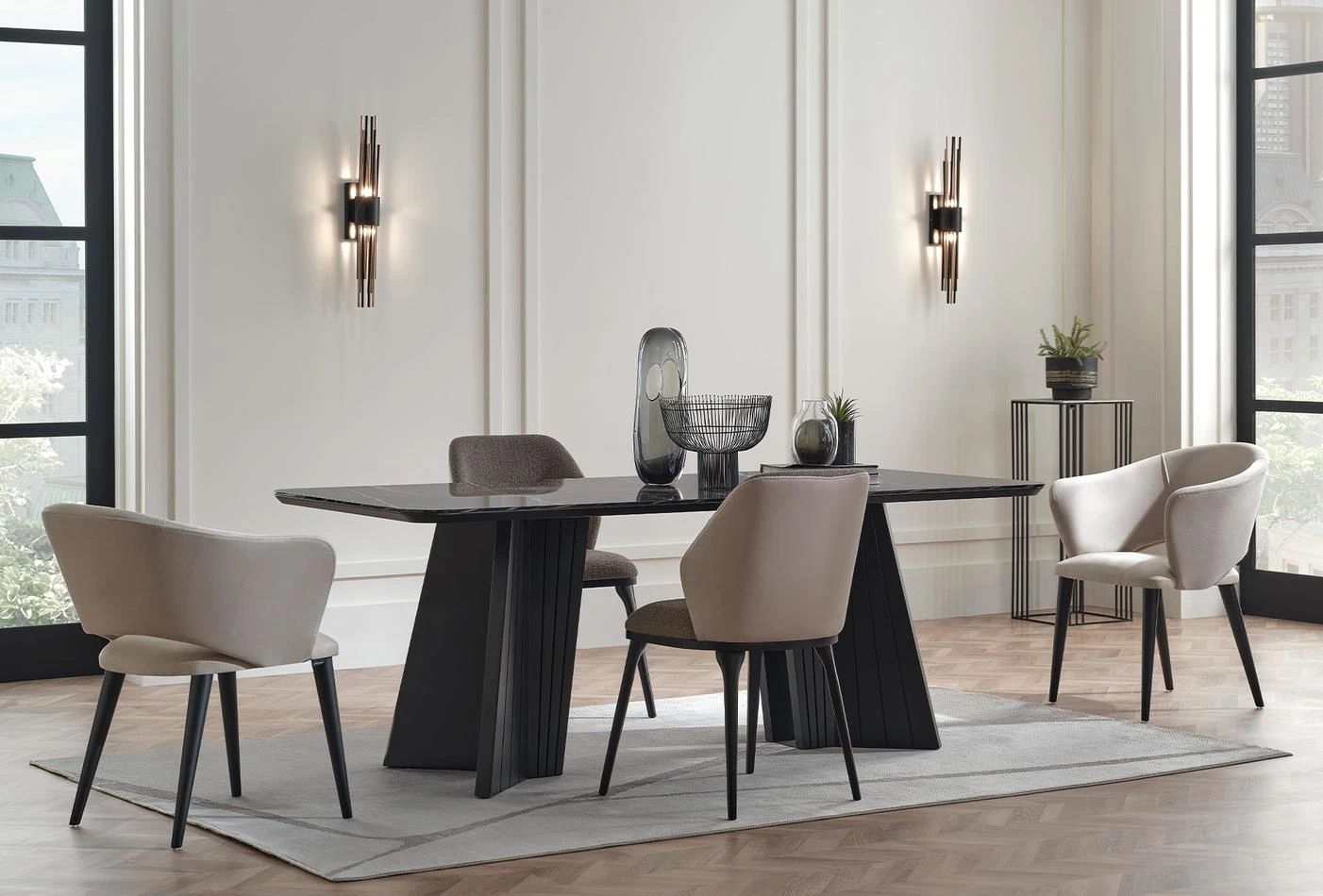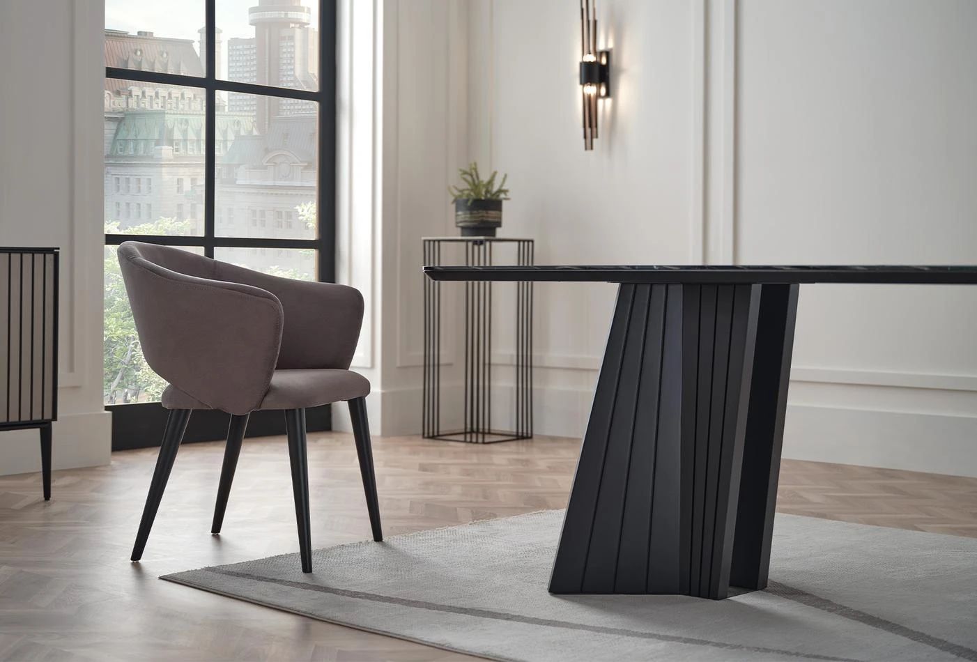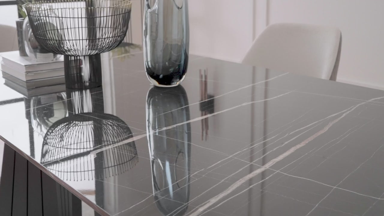 Предлага съвременен и луксозен външен вид, който отразява уникален контраст със своята лъскава повърхност и матови крака. Неговата естественост с черни матови дървени крака, използвани в дизайна му извежда модерността на преден план със своята подобна на мрамор горна повърхност, успява да отрази два различни стила като цяло.
