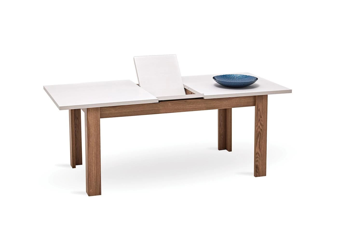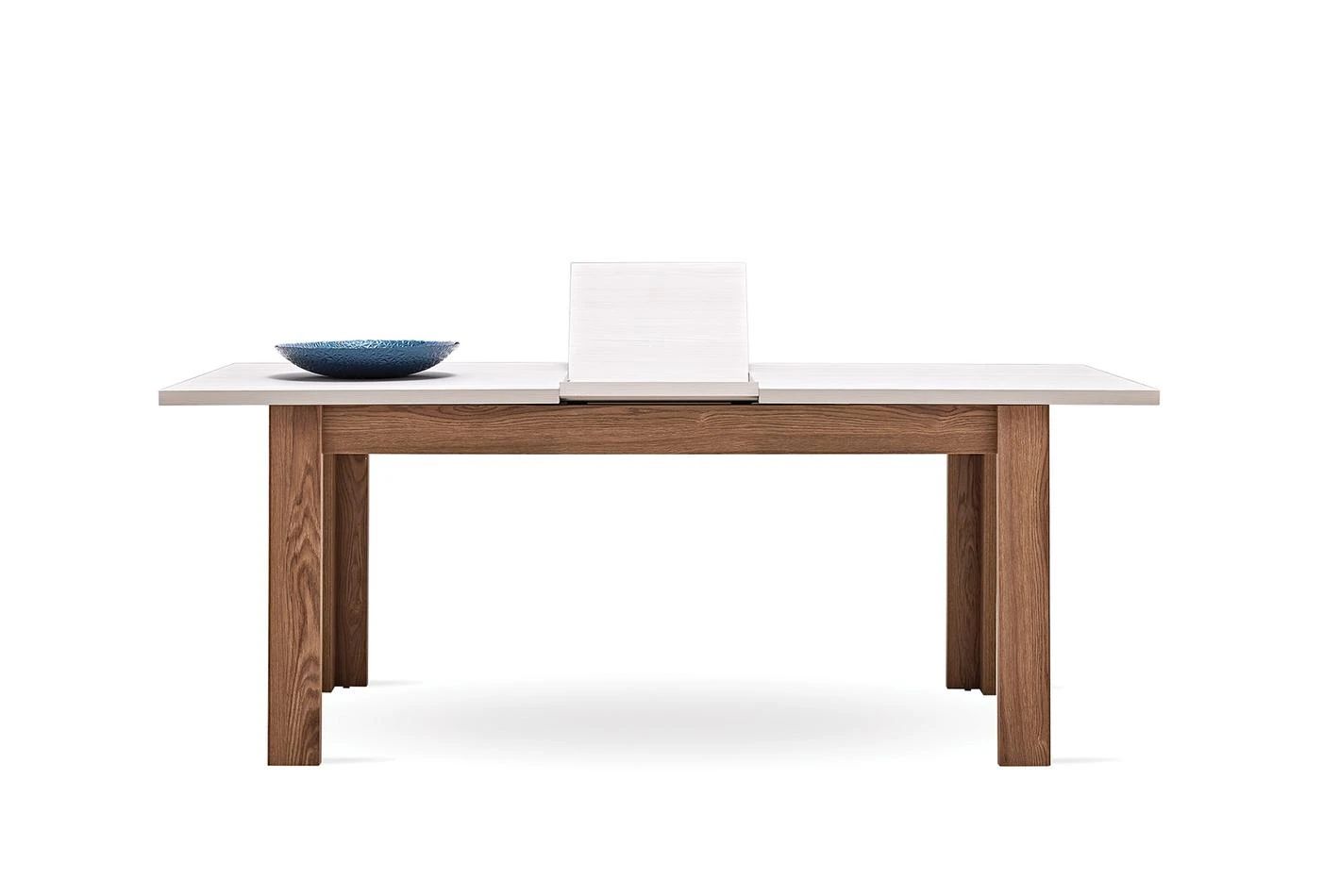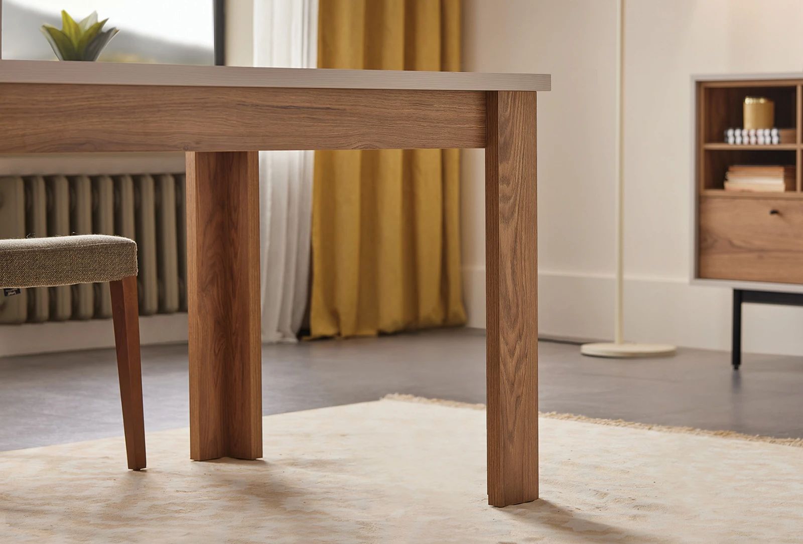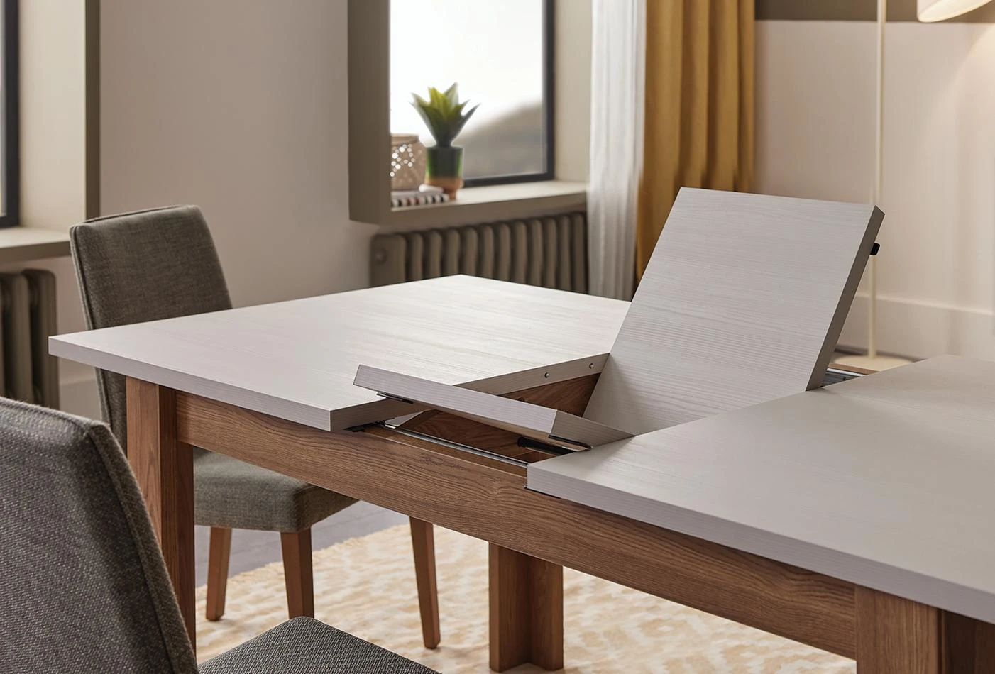 Разтегателната трапезна маса от серията допълва жилищните пространства със своя модерен индустриален стил. Характеристиките, които представят колекцията се съчетават със стилни детайли. Неговата структура, подходяща за различни комбинации, капацитет 6/8 места и идеални размери ви позволяват да посрещнете гостите си по възможно най-добрия начин. Комбинация от цветове - крем и орех.