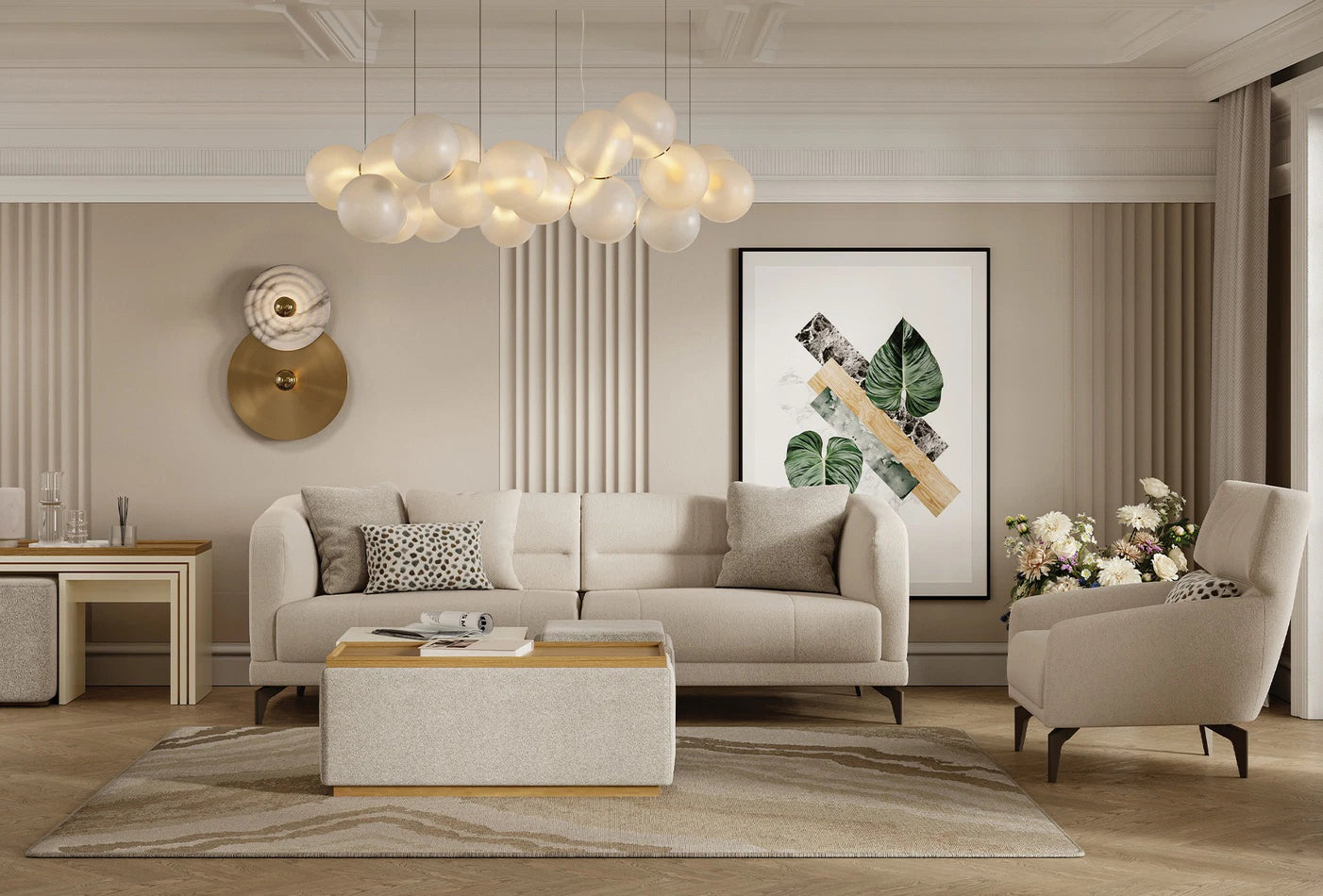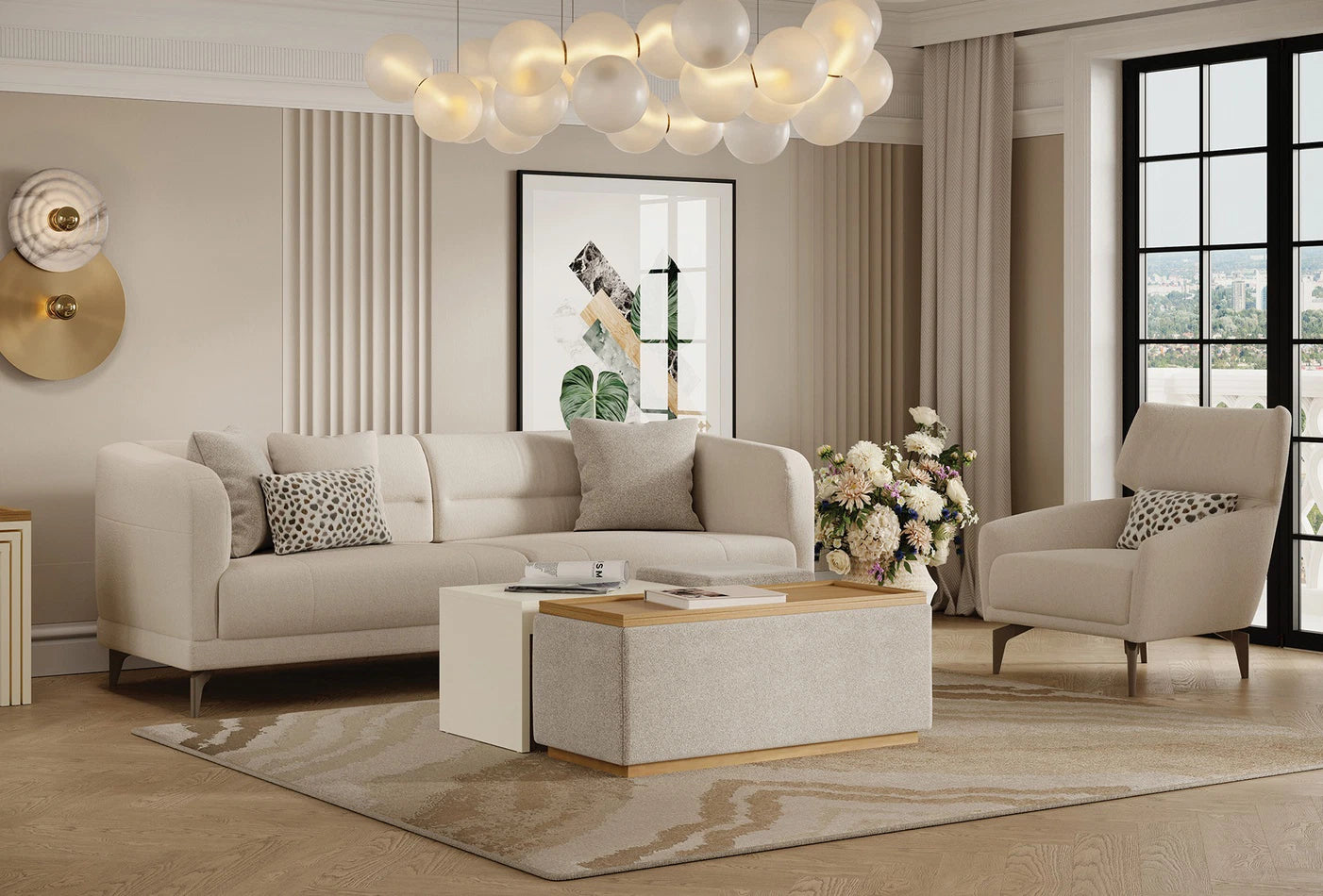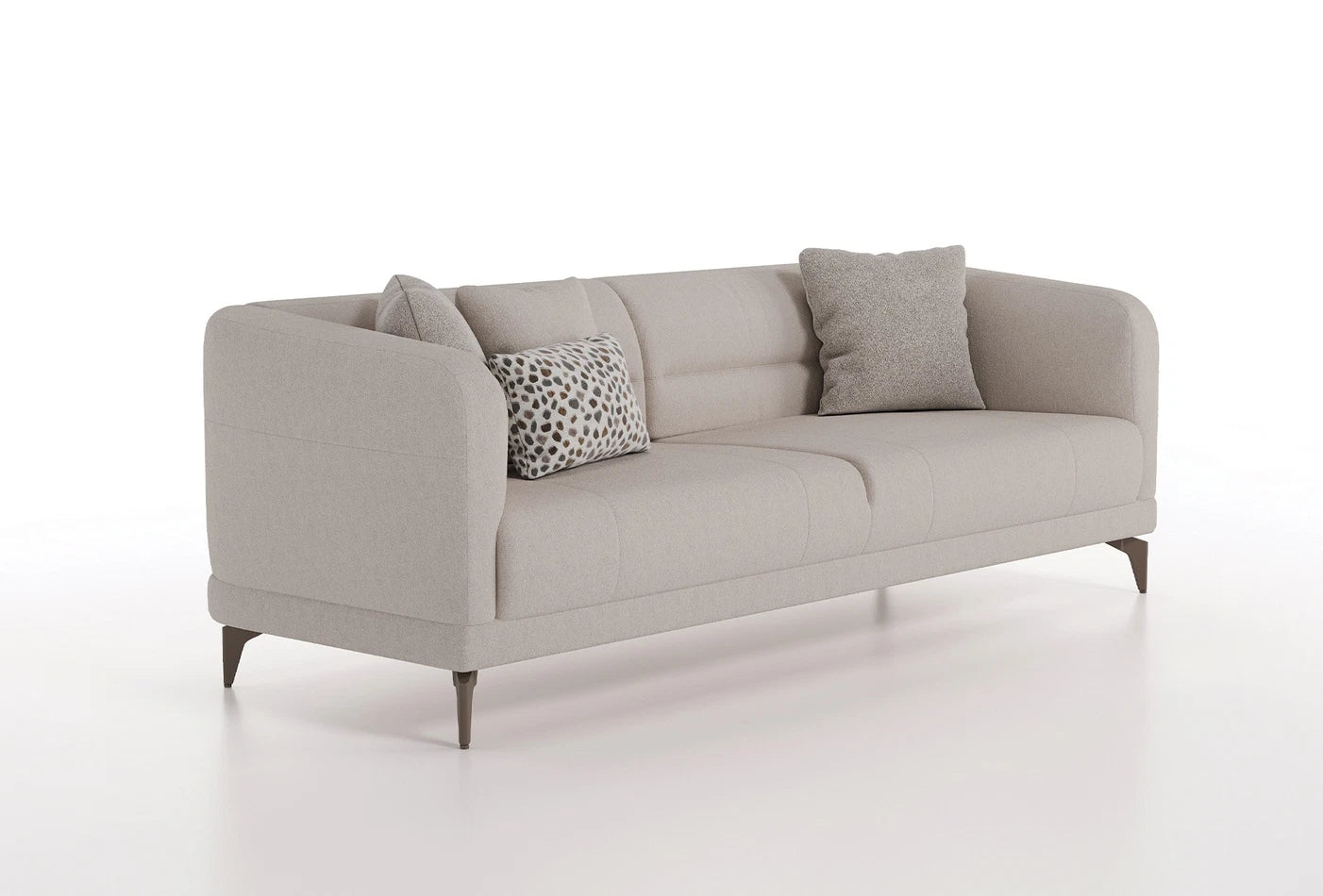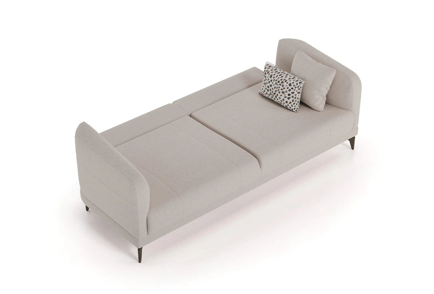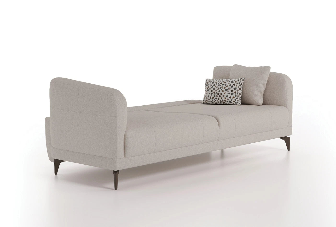 Триместният разтегателен диван Marsana изпъква със своите изчистени линии и съвременен дизайн. В бежови тонове и с декоративни възглавници, той придава модерна елегантност на всяко жилищно пространство. Благодарение на механизма за разгъване, диванът лесно се превръща в удобно легло при нужда, а четирите възглавници осигуряват комфортно изживяване при сядане. Високите крака улесняват почистването, а материята, която се почиства лесно, прави ежедневната употреба още по-практична.