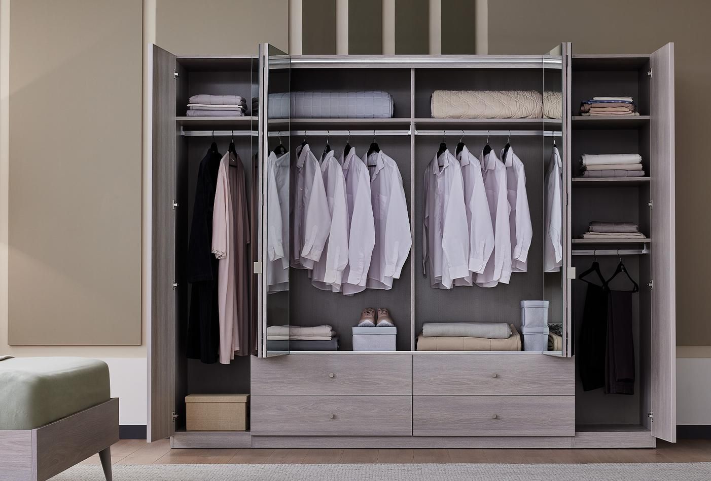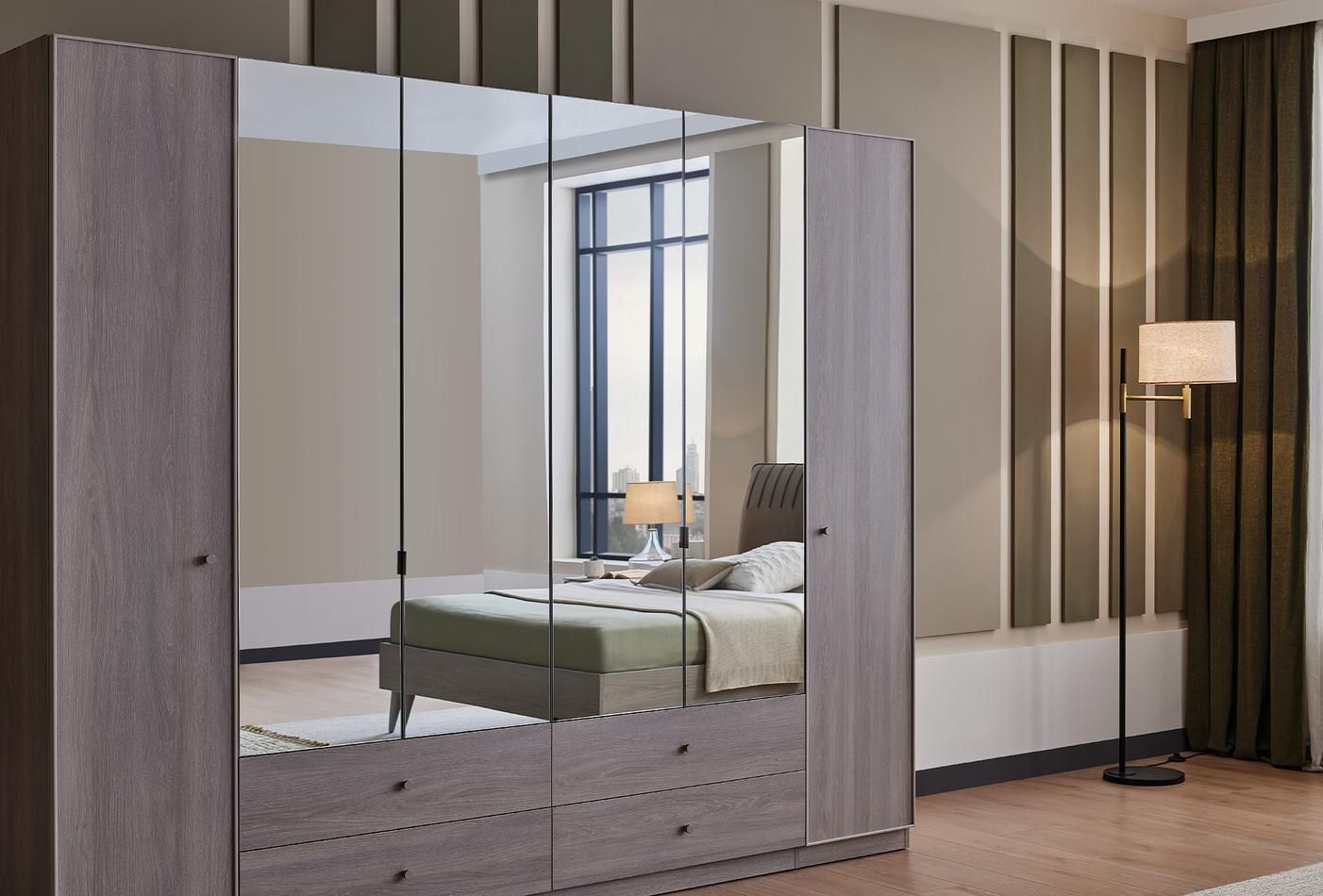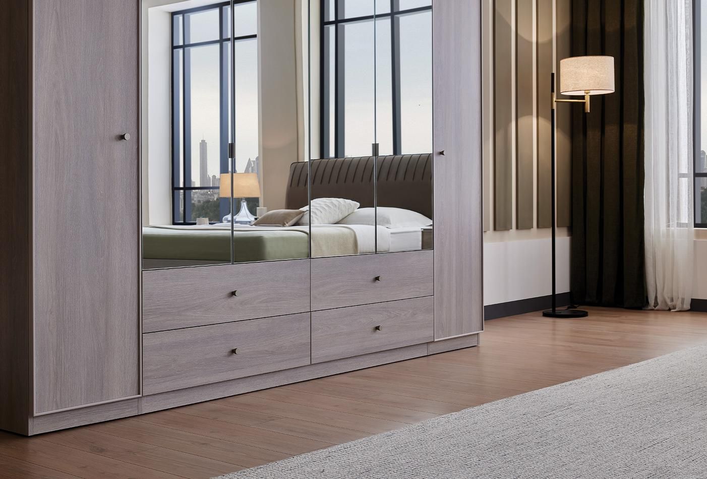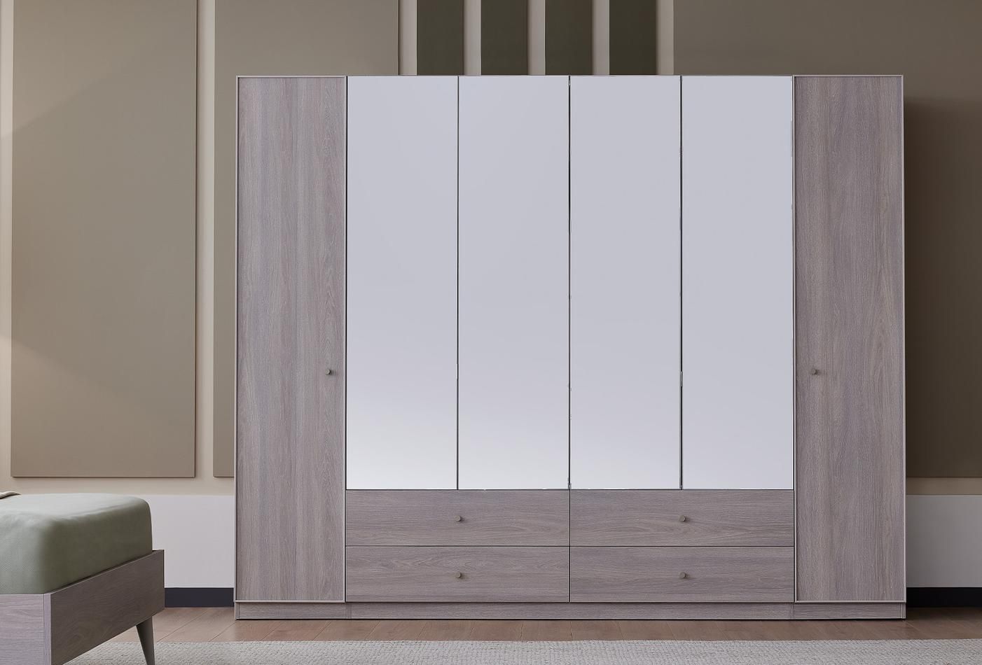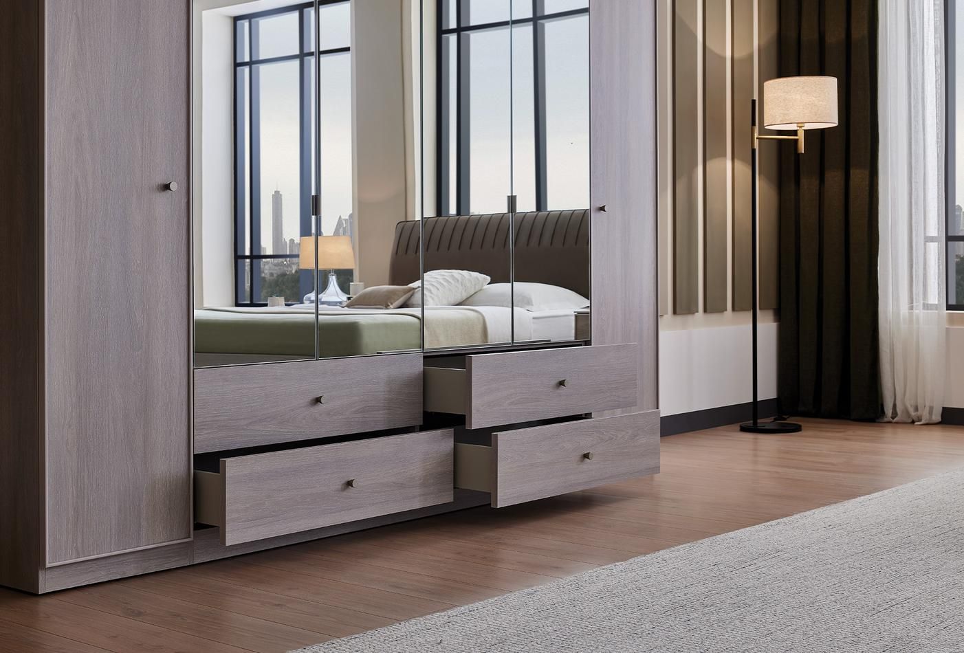 Привличайки вниманието с минималистичния си дизайн добавя модерен щрих, като придава светъл и приветлив вид на пространствата, в които се намира. Проектиран в цветова комбинация от светъл дъб и светло бежово. Привлича вниманието с огледалната си апликация в естествен цвят и профилни детайли, които допълват дизайна, като същевременно извеждат елегантността на преден план с дизайна на дръжките си в цвят метален никел в хармония с колекцията апликацията на акордеон. Предлага възможност за съхранение на различни видове предмети с 4 приложения за чекмеджета. По този начин може да се получи допълнително място за много артикули.