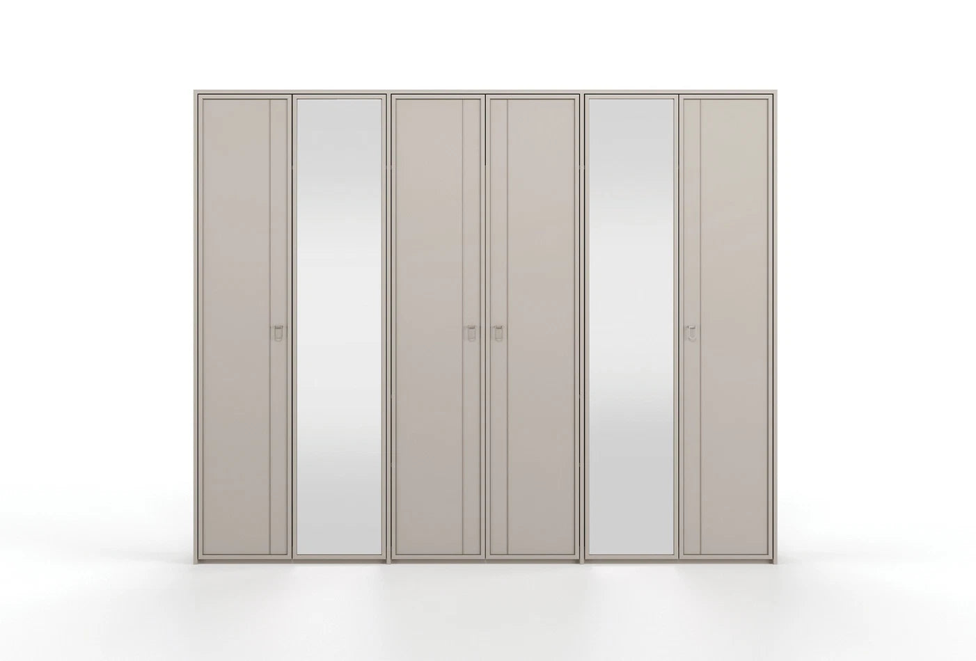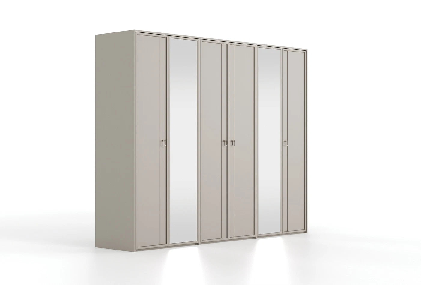 Гардероб HERA представлява идеалния синтез между елегантност и функционалност. Успокояващият камъчен нюанс на корпуса се хармонира перфектно с естествените огледални детайли, а луксозните метални дръжки в бронзов цвятдобавят съвременна изтънченост.