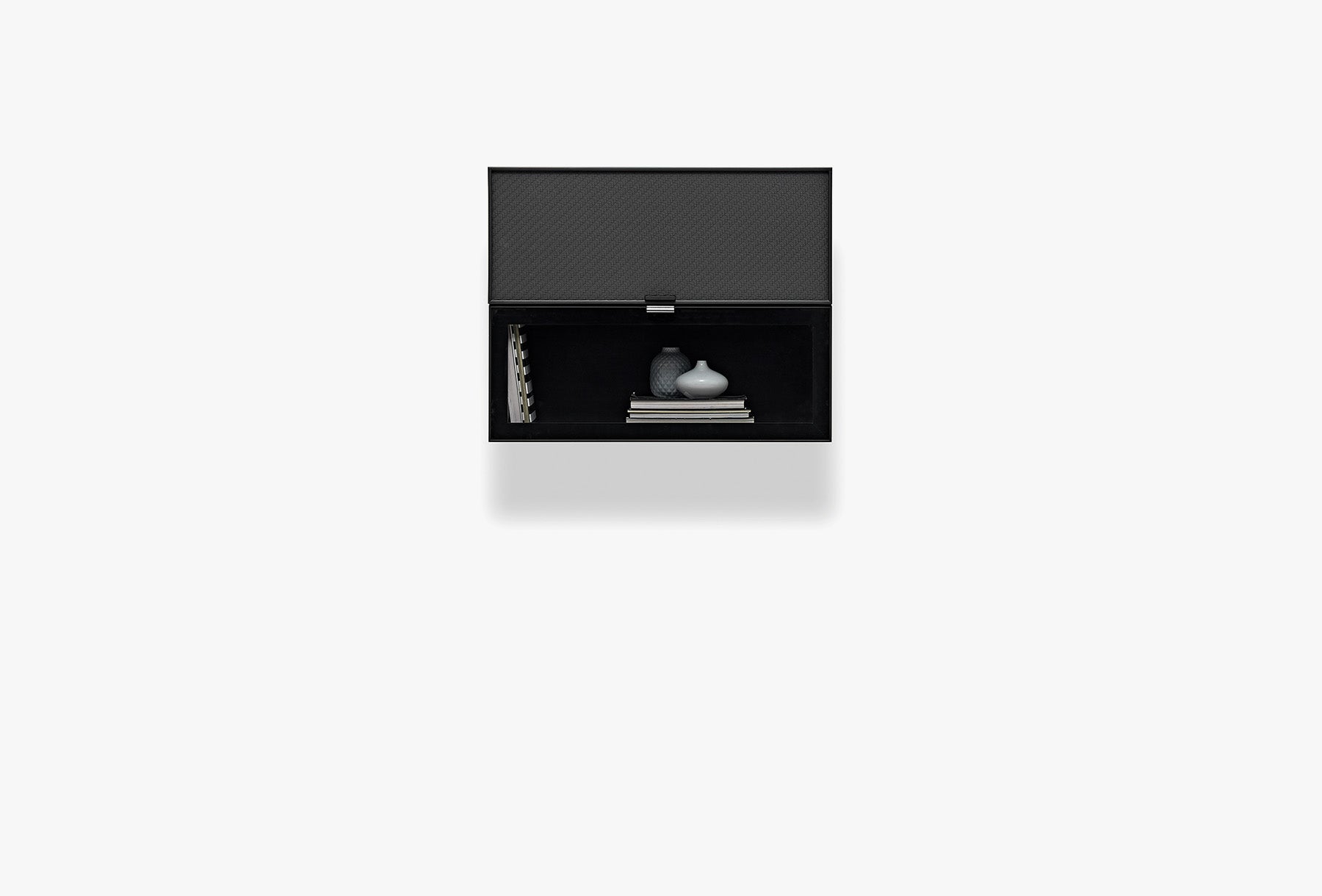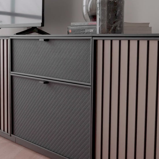 Благодарение на комбинацията от стъкло, черна профилна рамка, метален ефект върху корпуса, черни матирани метални дръжки и кожени вложки, шкафът подчертава елегантността и изтънчеността на интериора.